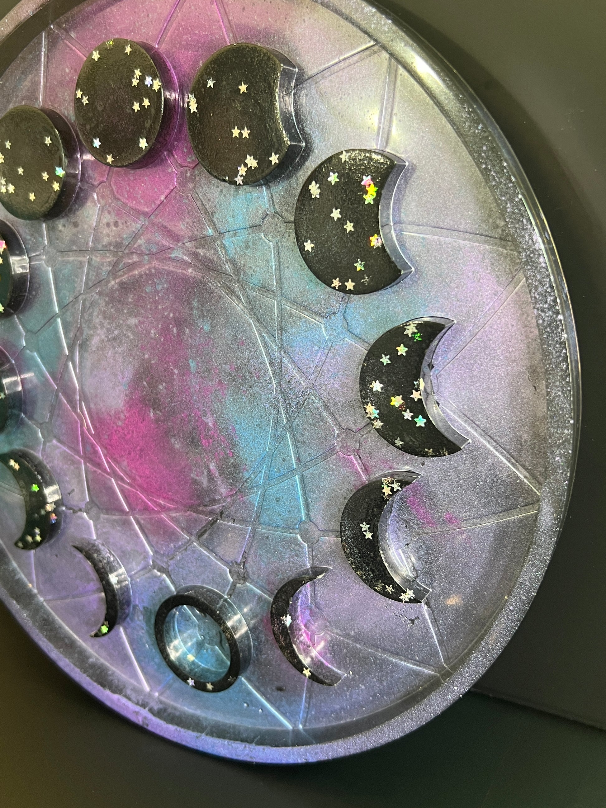 The raised 3-D moon phases — sleek black crescents adorned with tiny iridescent stars — form a celestial orbit around the tray, symbolizing intuition, transformation, and the wisdom found in darkness. Each star sparkles like a spell waiting to be cast.