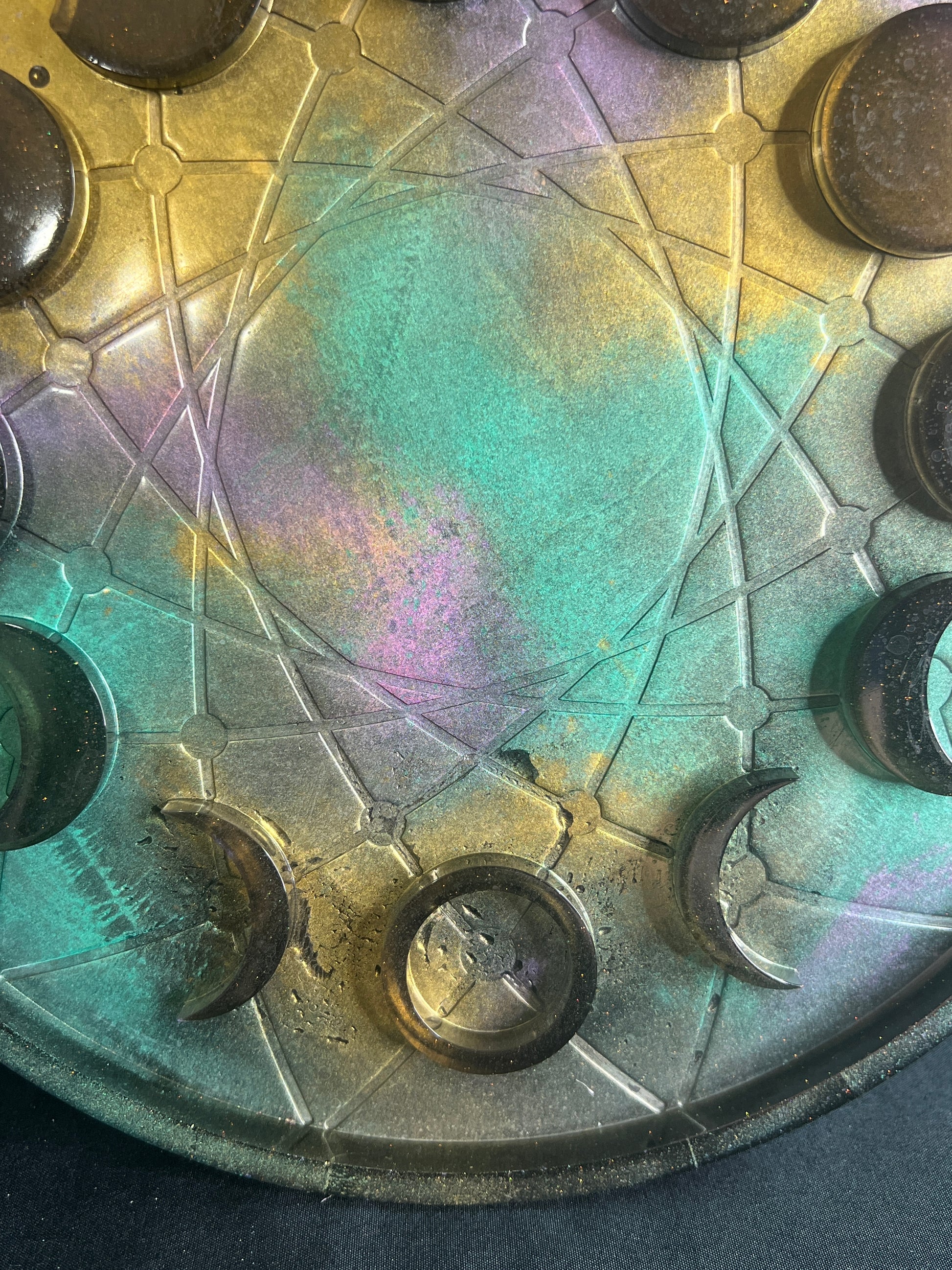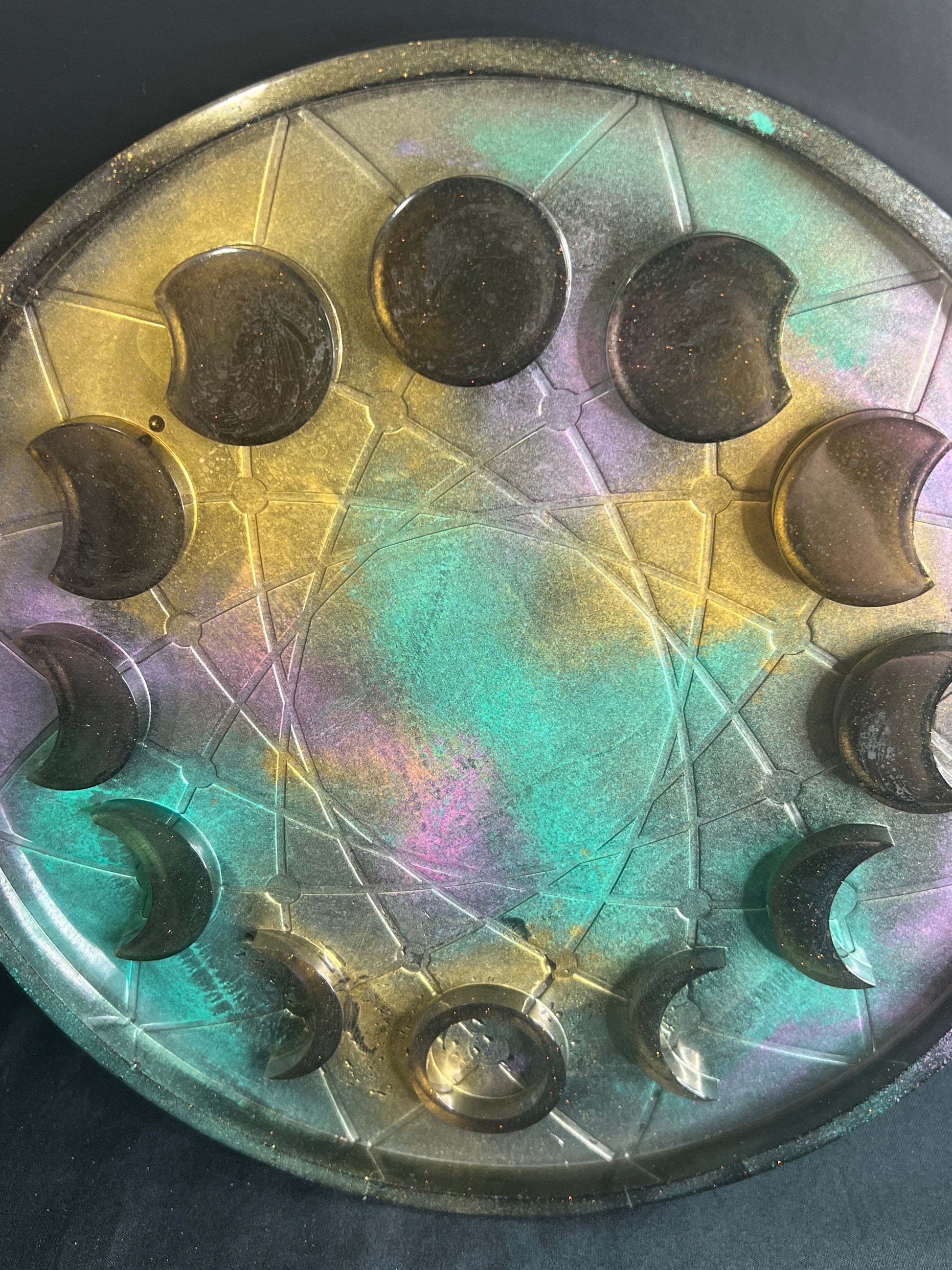 Raised black moon phases orbit the tray in sleek, glossy resin, grounding the ethereal colors with deep lunar power. Each phase embodies intention, release, transformation, and renewal — forming a sacred wheel that guides your personal magic.