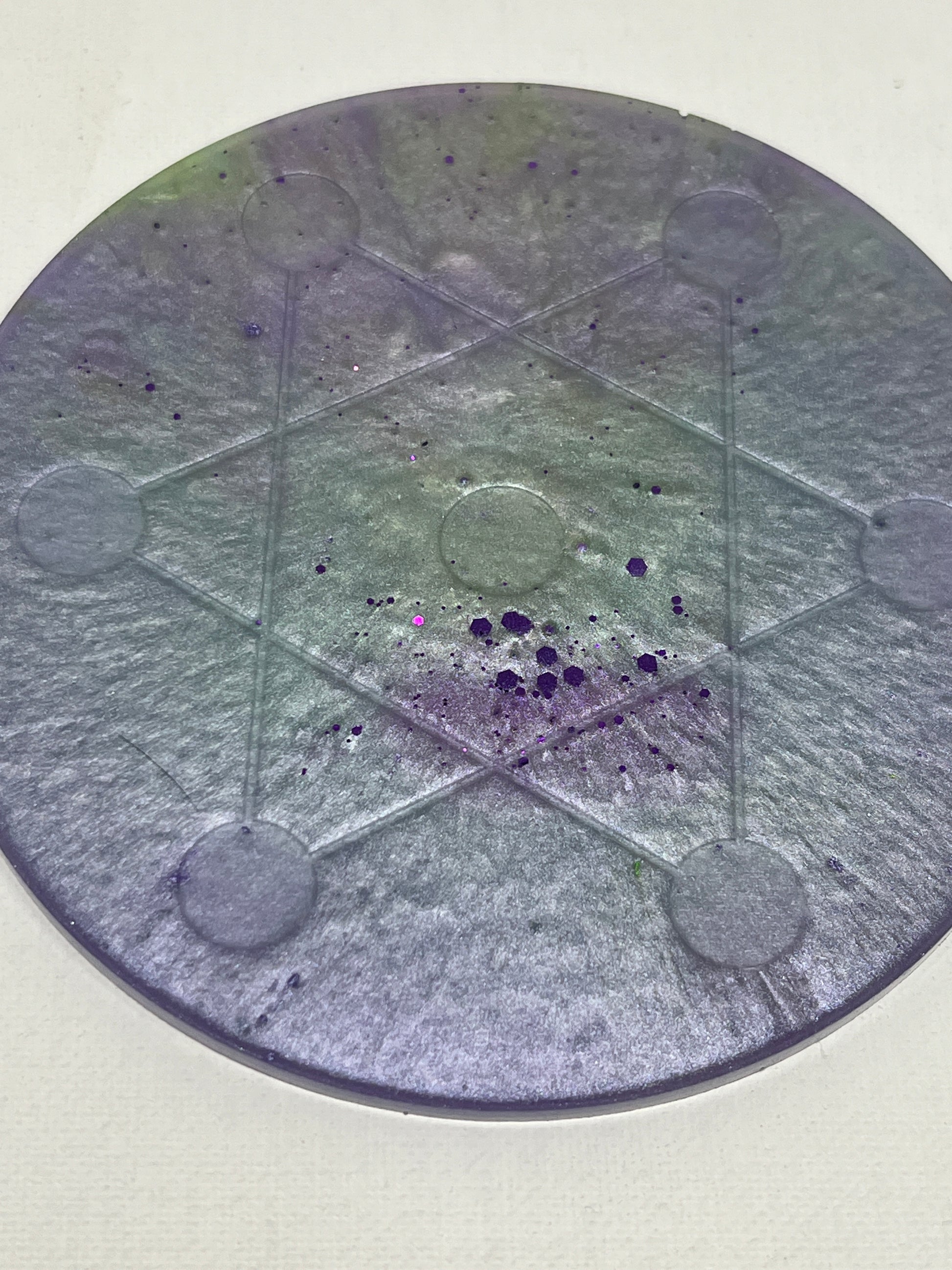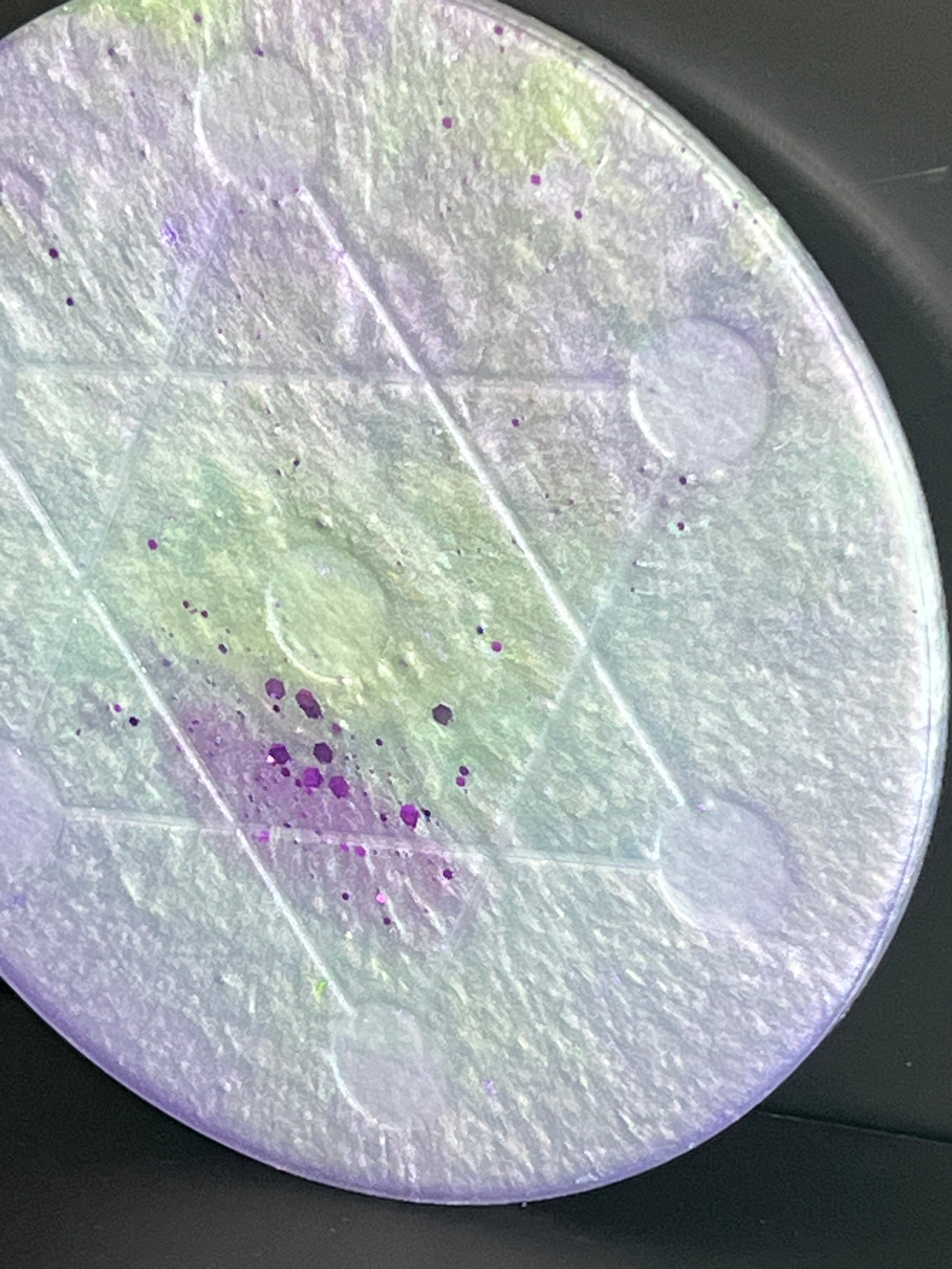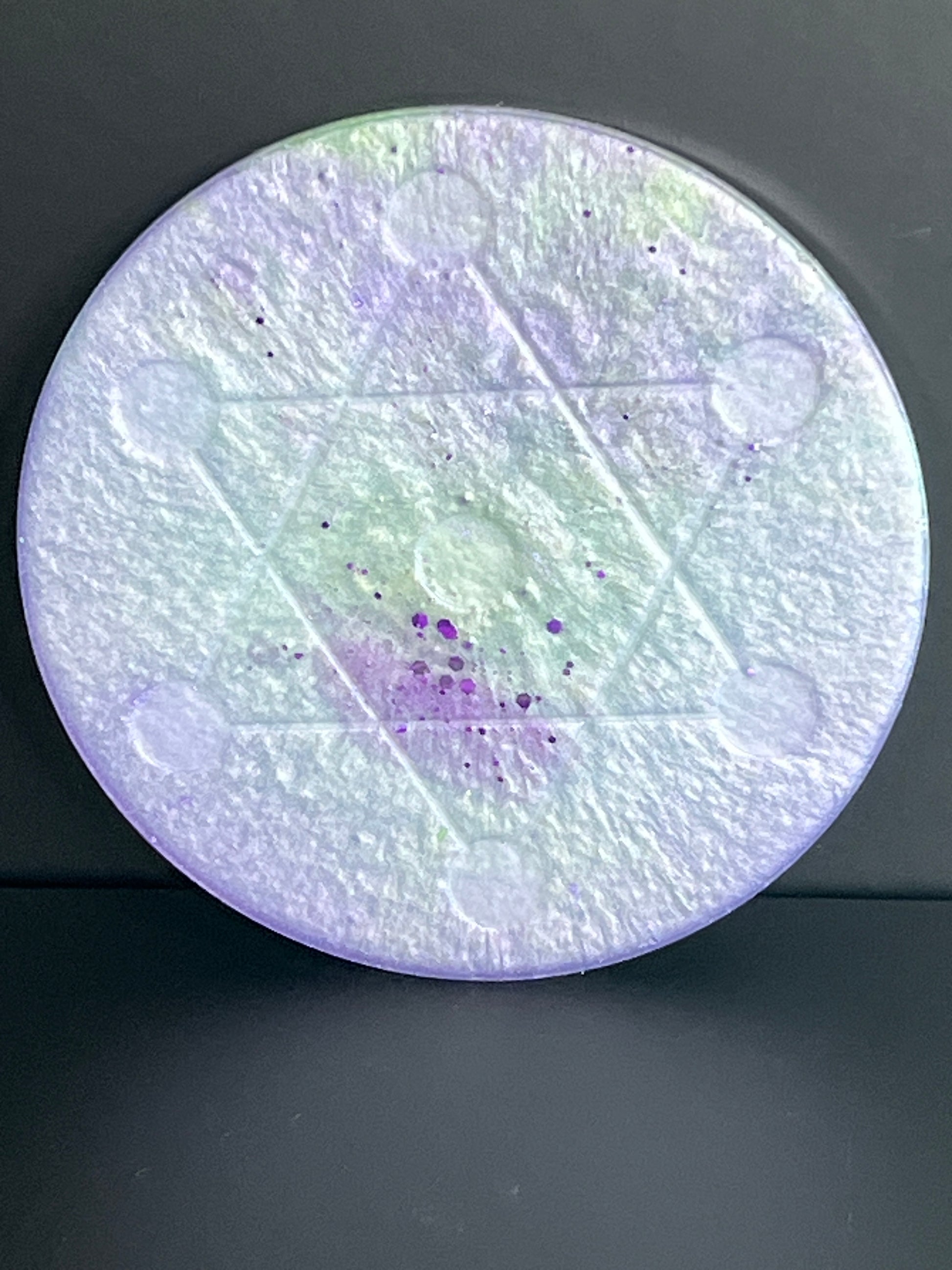 This 5-inch Crystal Grid features a luminous blend of soft lavender, pearlescent white, and misty green tones, creating the feeling of light diffused through fog at dawn. Subtle shimmer and scattered flecks drift beneath the surface, giving the piece a quiet, ethereal presence that feels calming rather than commanding.