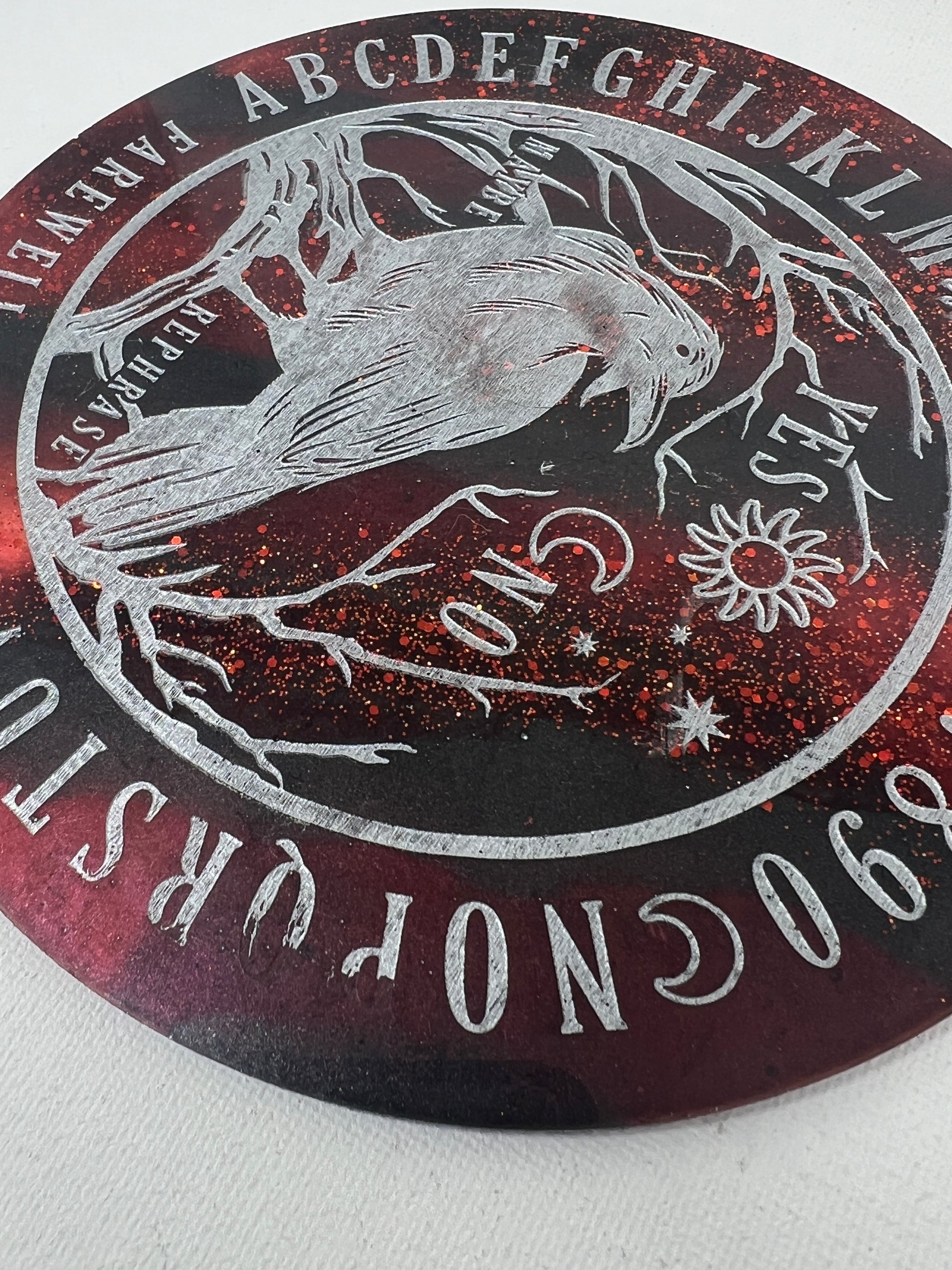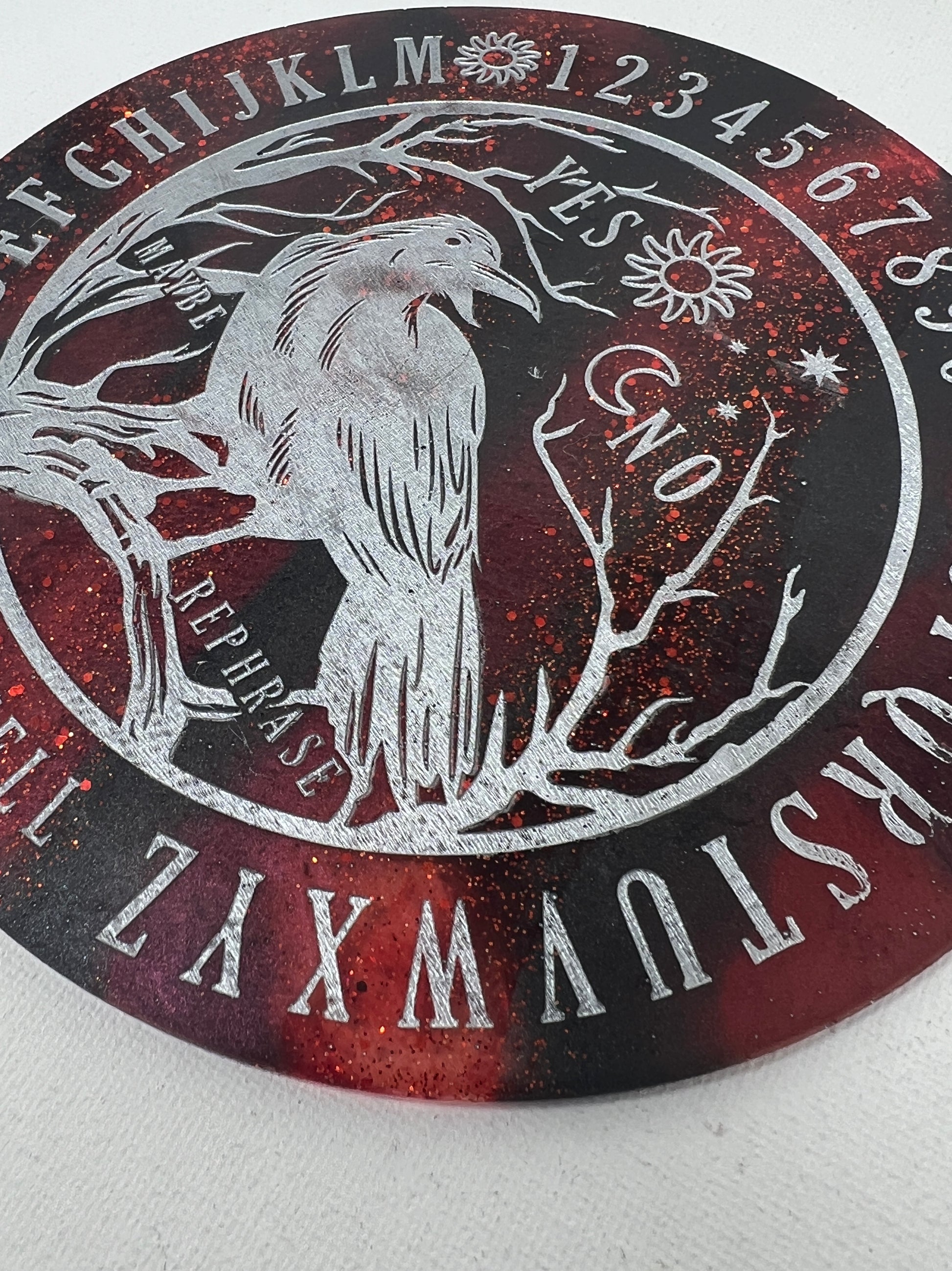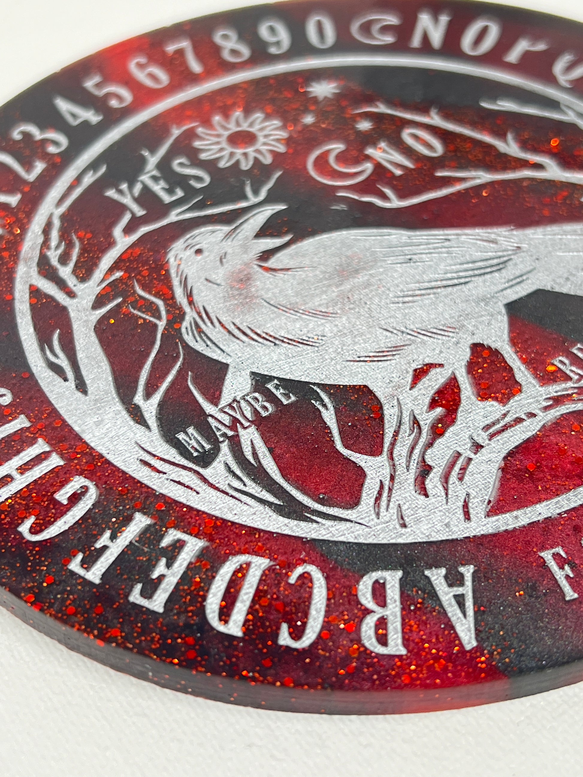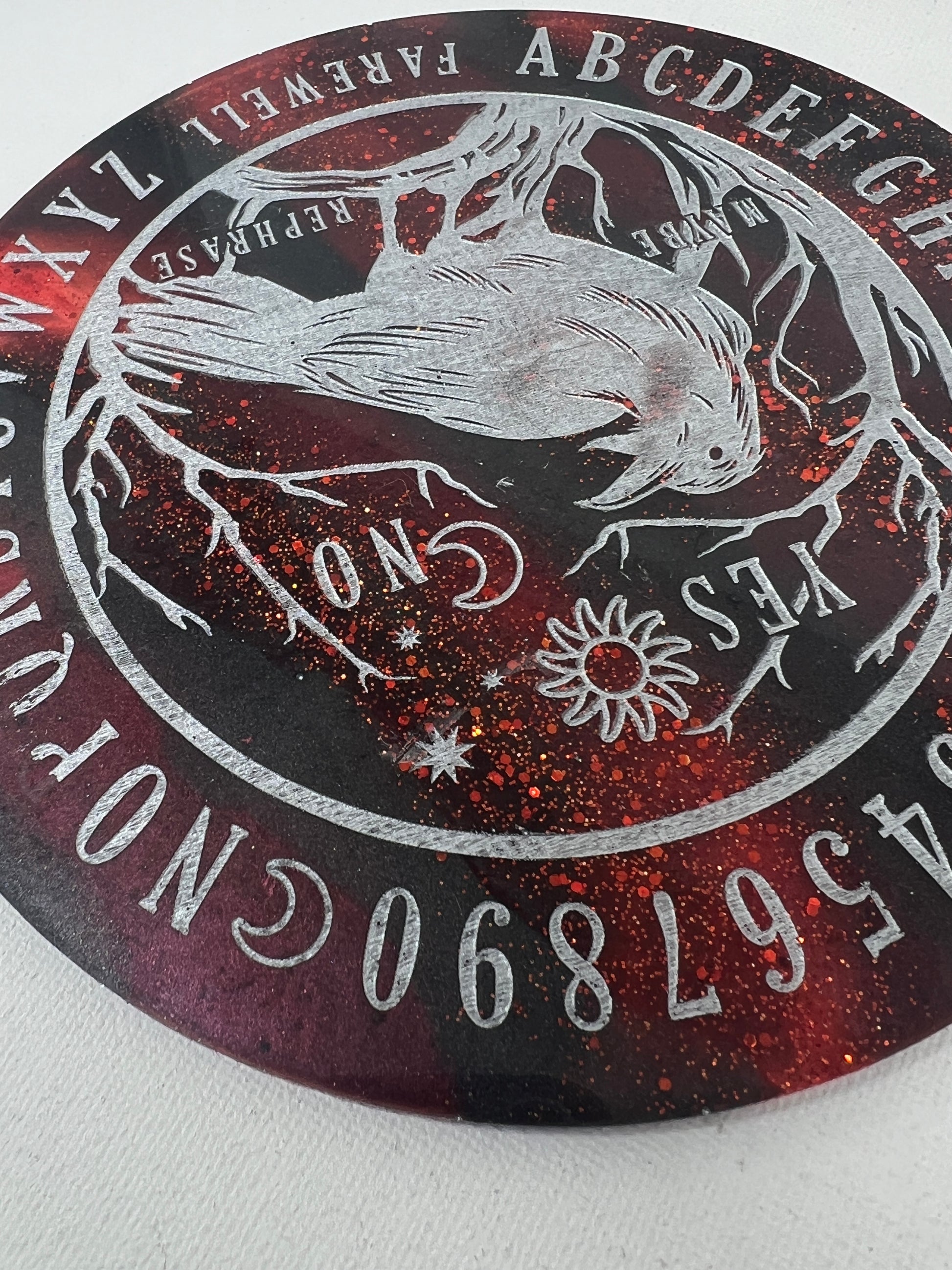 Cloaked in the deep, smoldering tones of a blood moon’s glow, the Blood Moon Raven Spirit Board brings an air of intensity and ancient wisdom to your divination practice. The raven, a guardian of mysteries and messenger from the beyond, perches with a knowing gaze, surrounded by barren branches etched in shimmering silver. Splashes of crimson dance across the board, echoing the energy of lunar cycles and the mysteries they hold. Use this board to dive into the heart of your questions, guided by the raven’s silent strength and the transformative power of the blood moon. Let the whispers of the cosmos come to life as you seek clarity and connection with the unseen.