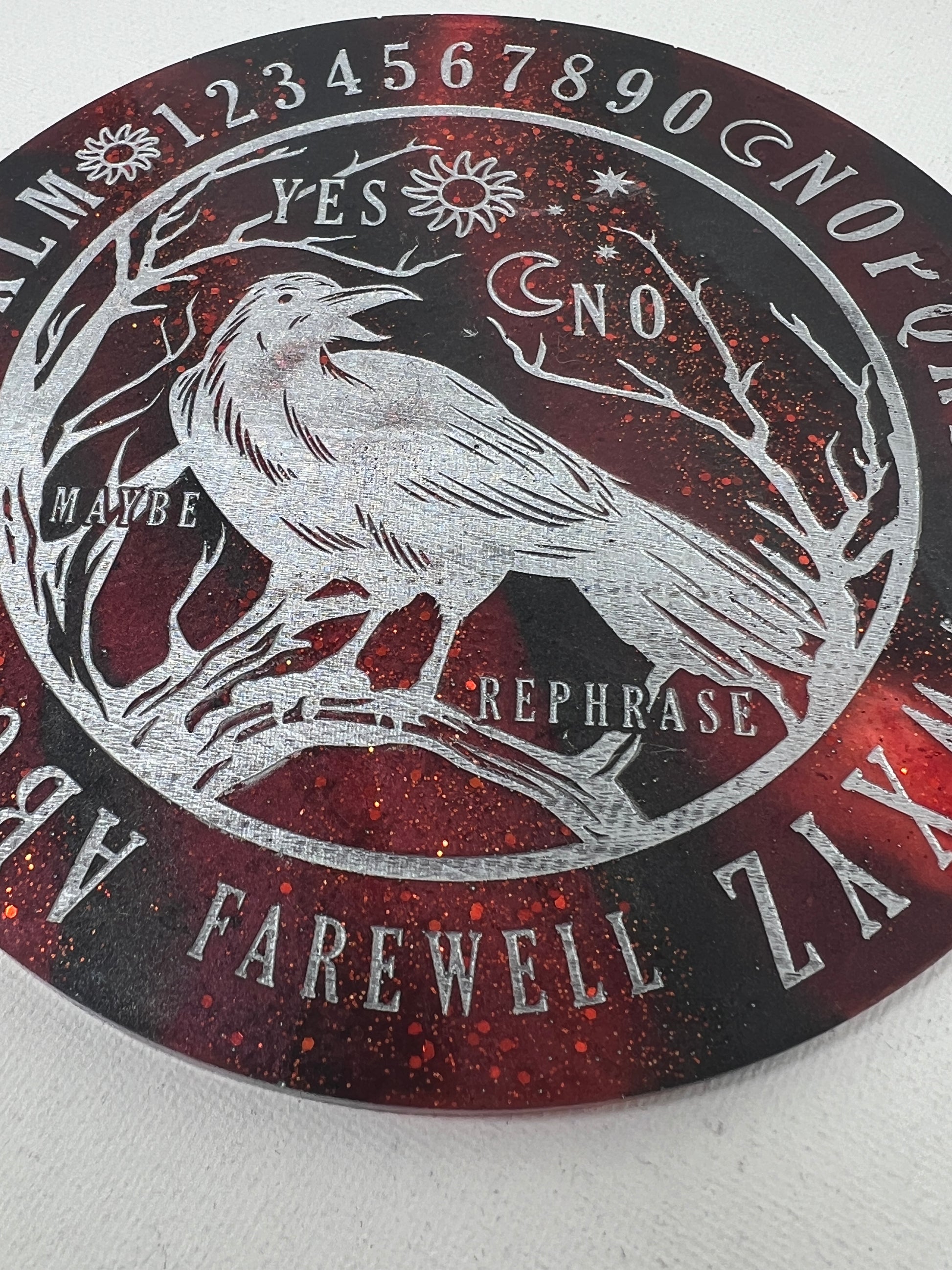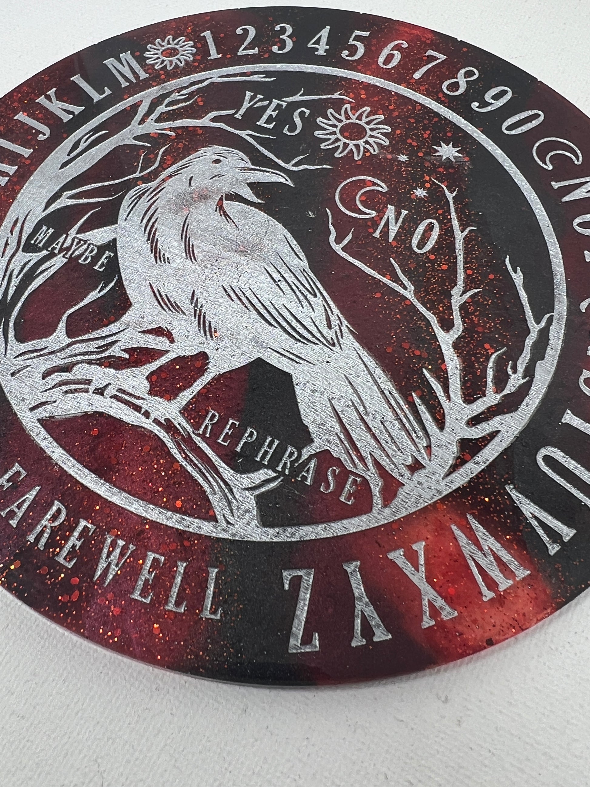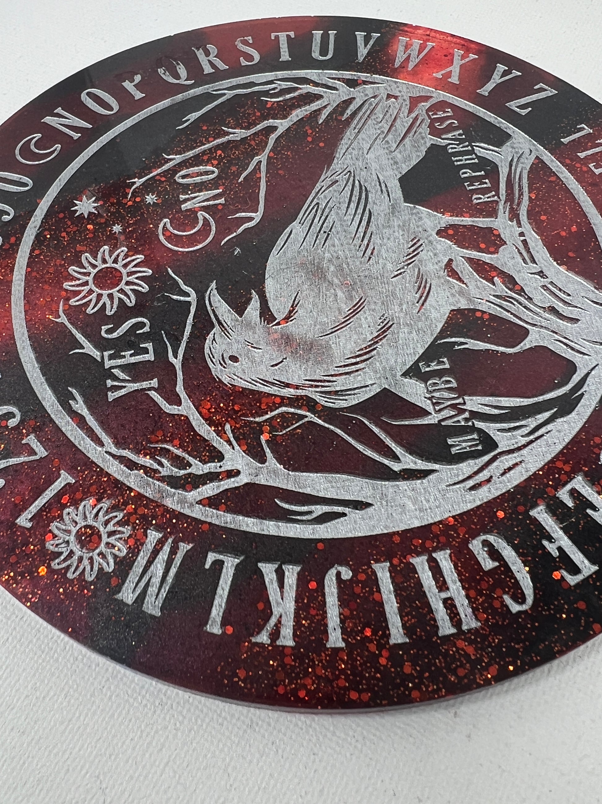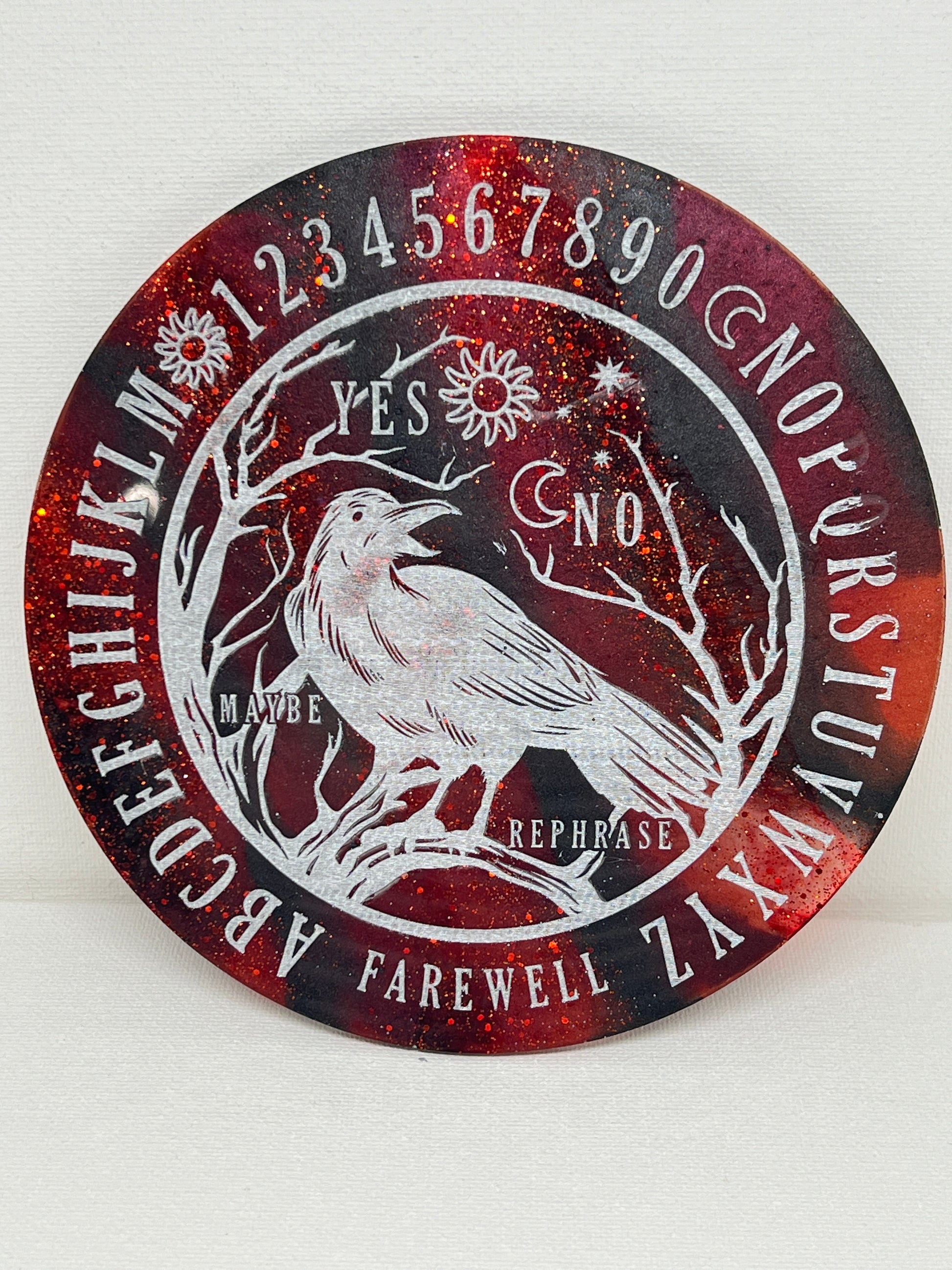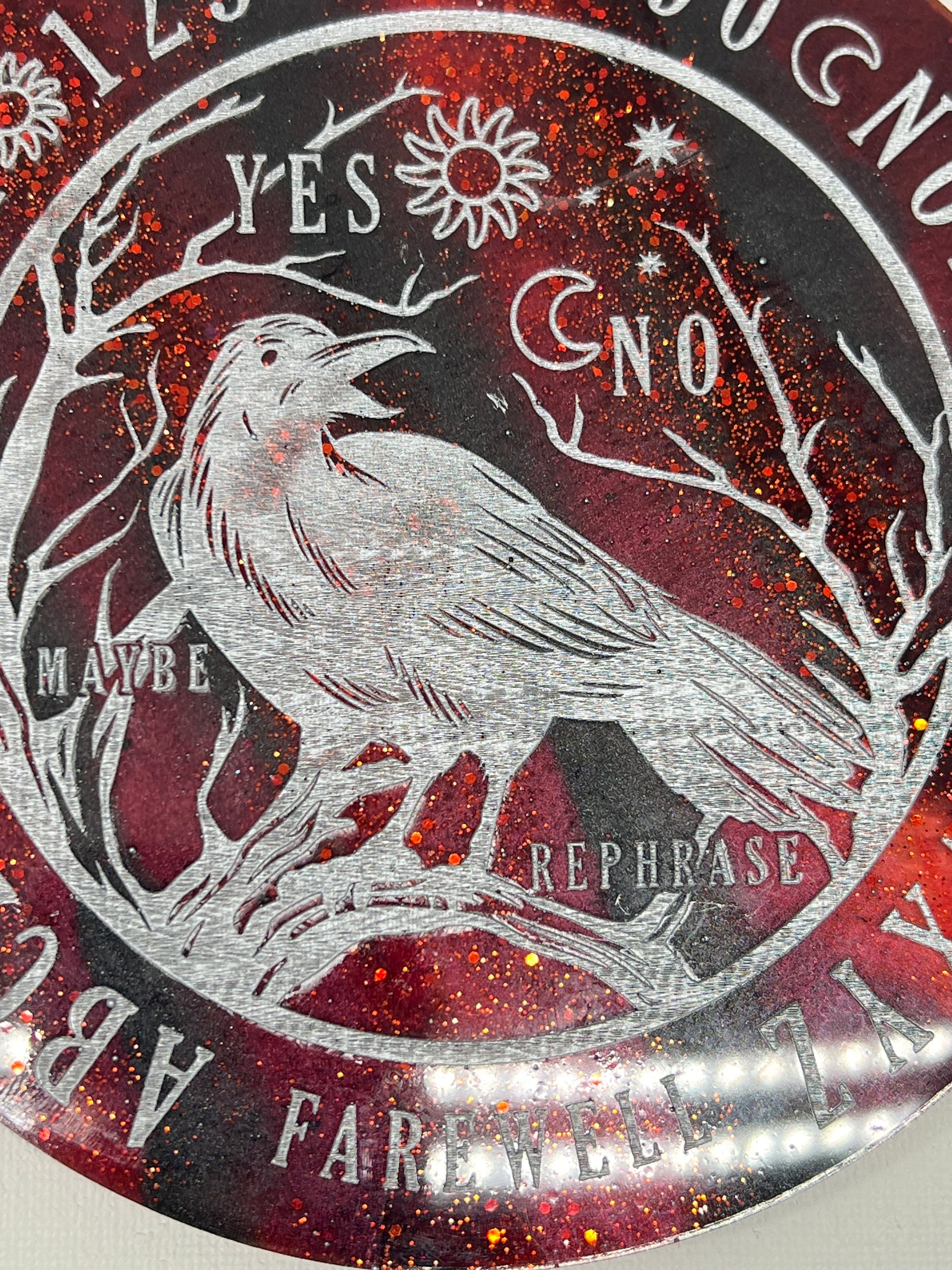 Cloaked in the deep, smoldering tones of a blood moon’s glow, the Blood Moon Raven Spirit Board brings an air of intensity and ancient wisdom to your divination practice. The raven, a guardian of mysteries and messenger from the beyond, perches with a knowing gaze, surrounded by barren branches etched in shimmering silver. Splashes of crimson dance across the board, echoing the energy of lunar cycles and the mysteries they hold. Use this board to dive into the heart of your questions, guided by the raven’s silent strength and the transformative power of the blood moon. Let the whispers of the cosmos come to life as you seek clarity and connection with the unseen.
