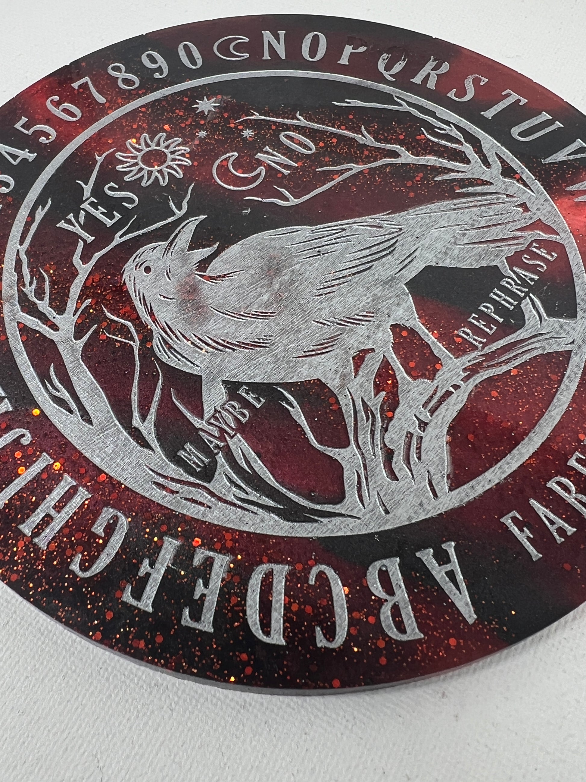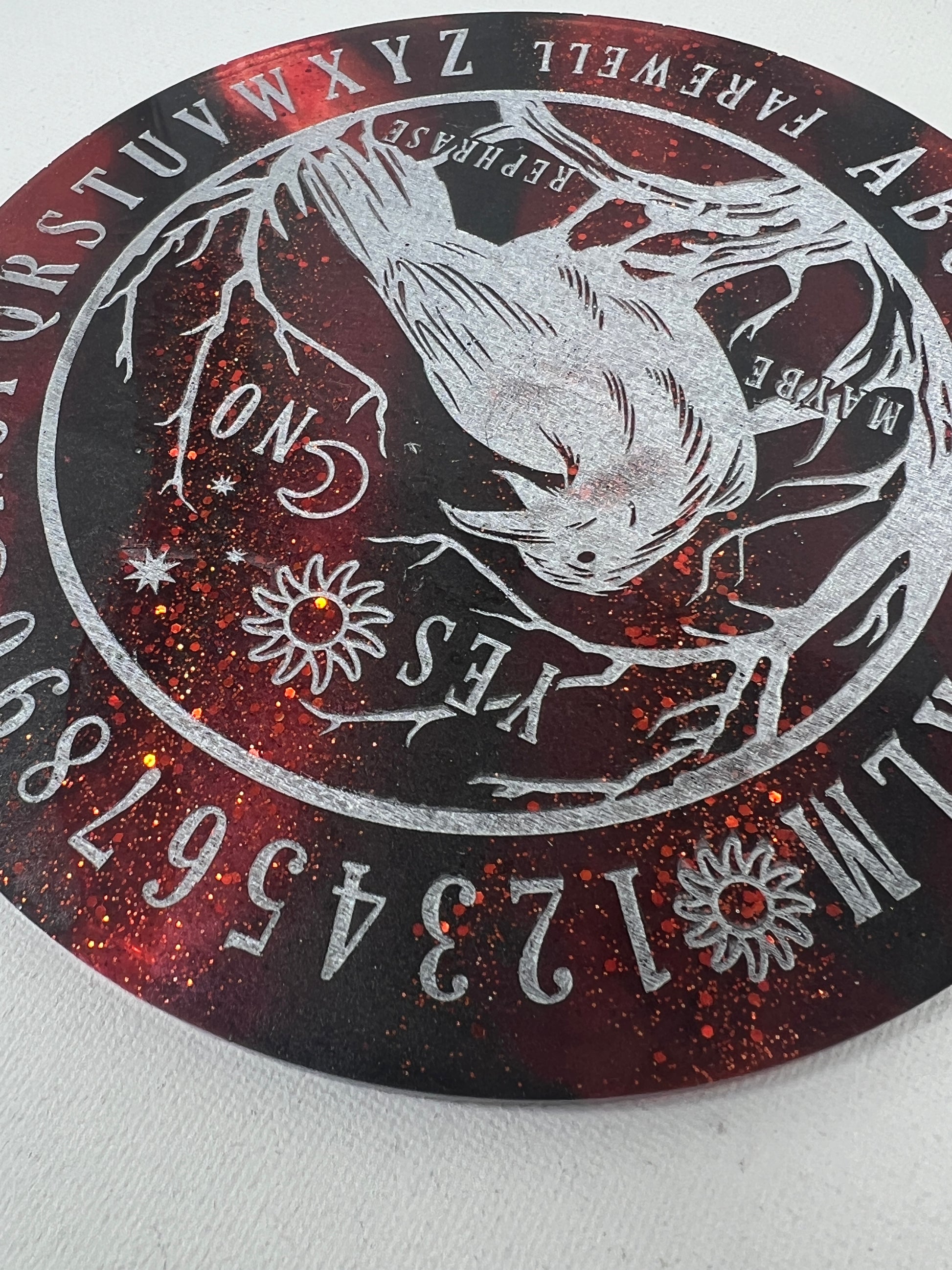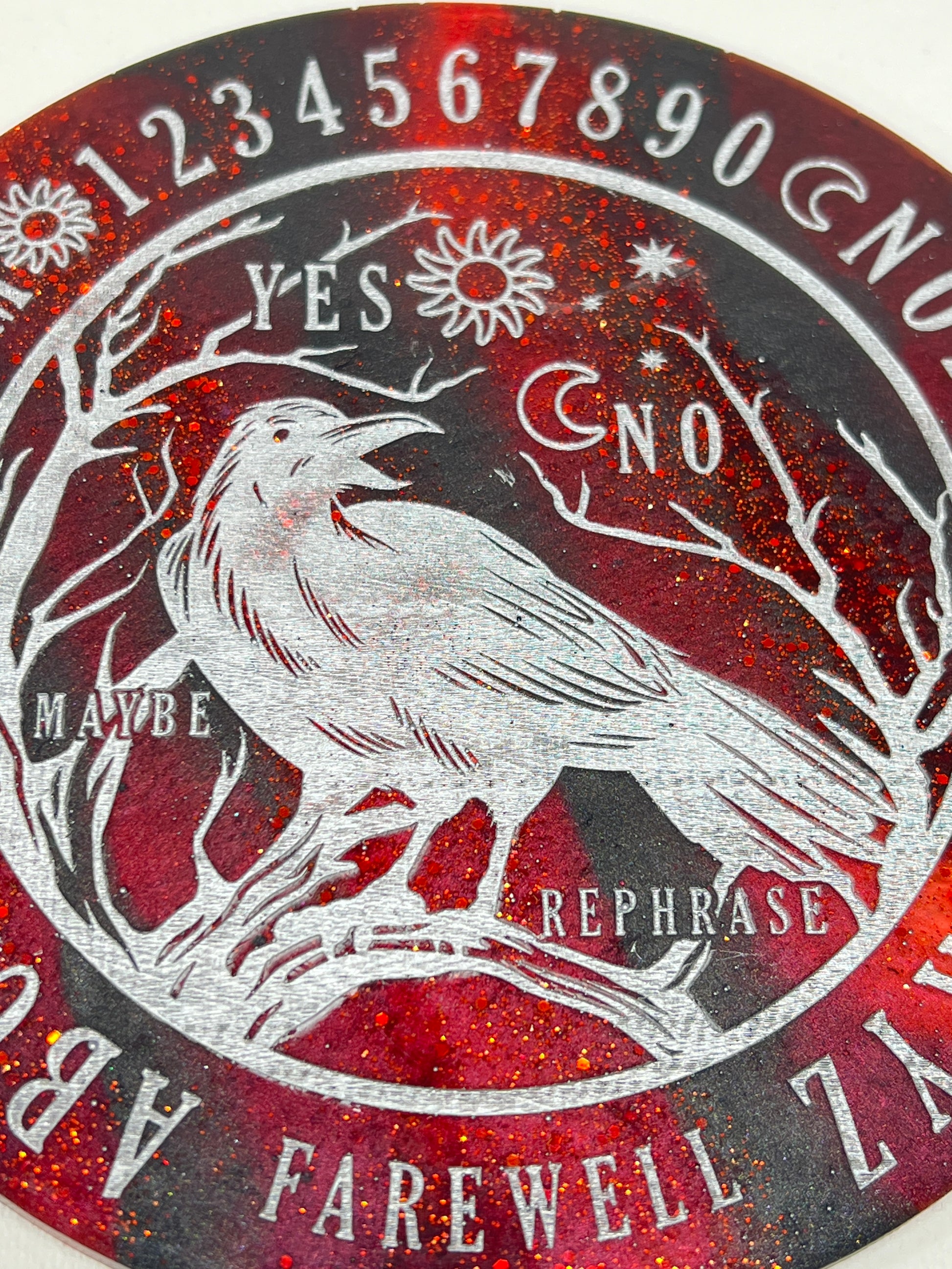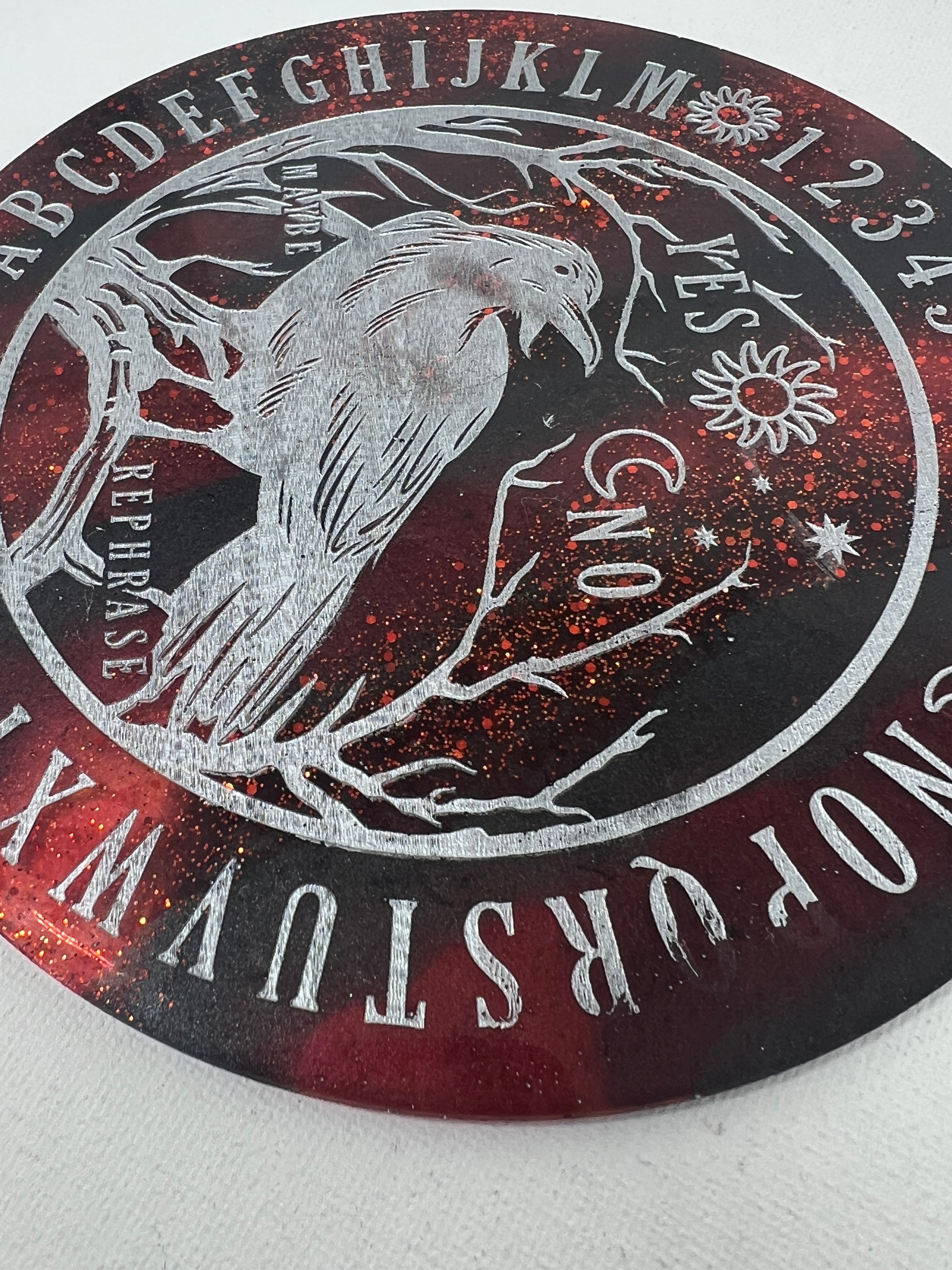 Cloaked in the deep, smoldering tones of a blood moon’s glow, the Blood Moon Raven Spirit Board brings an air of intensity and ancient wisdom to your divination practice. The raven, a guardian of mysteries and messenger from the beyond, perches with a knowing gaze, surrounded by barren branches etched in shimmering silver. Splashes of crimson dance across the board, echoing the energy of lunar cycles and the mysteries they hold. Use this board to dive into the heart of your questions, guided by the raven’s silent strength and the transformative power of the blood moon. Let the whispers of the cosmos come to life as you seek clarity and connection with the unseen.