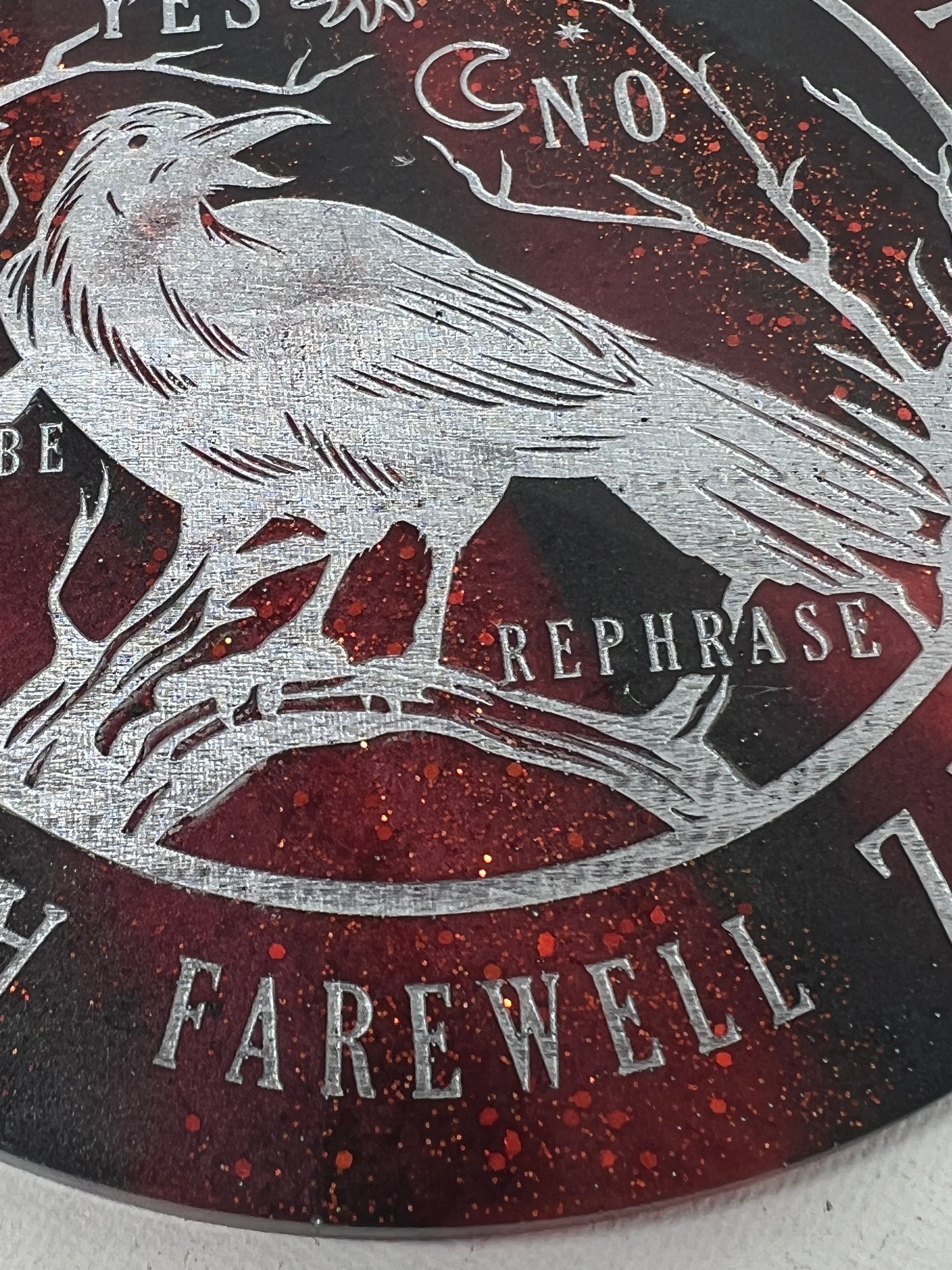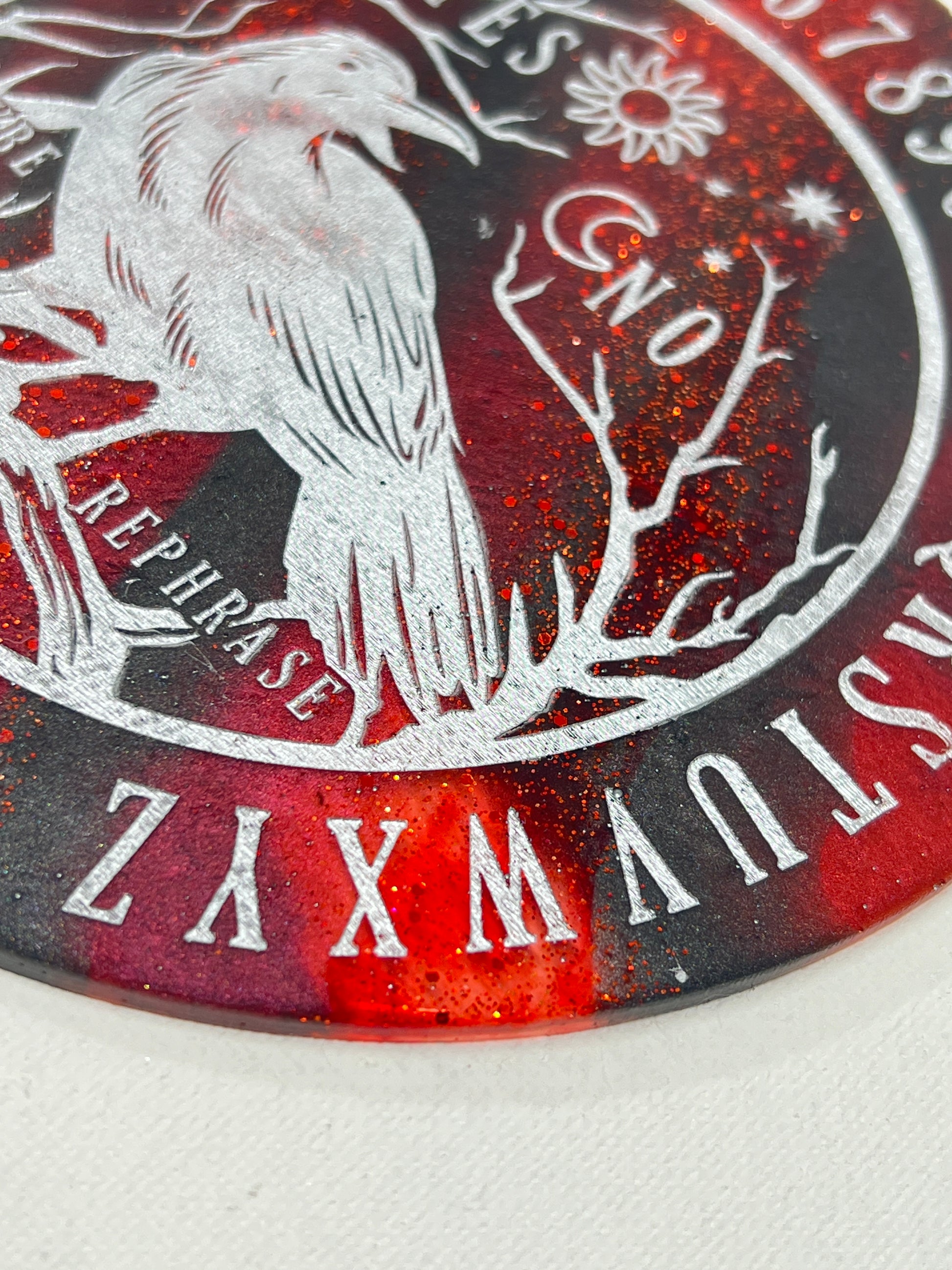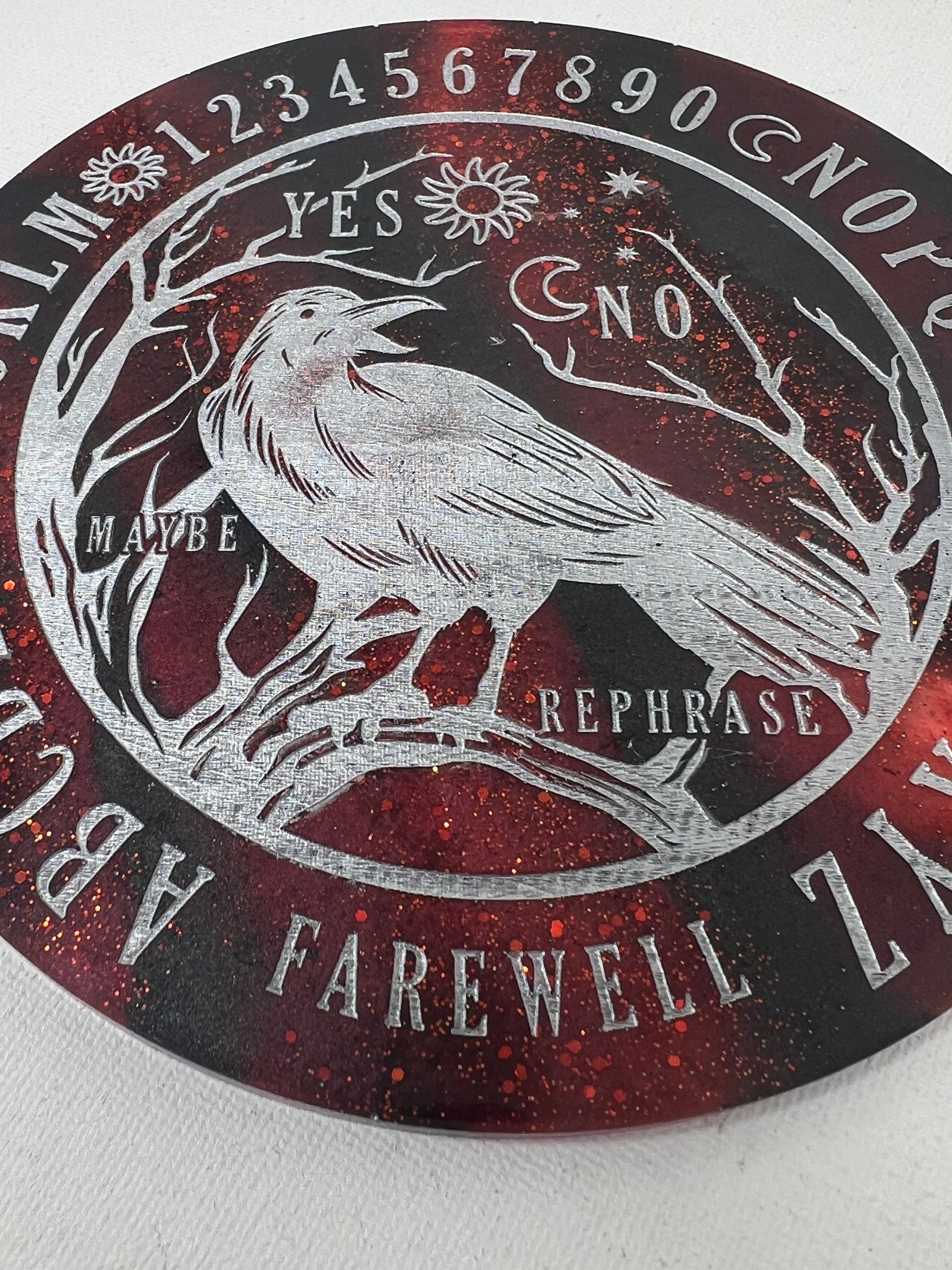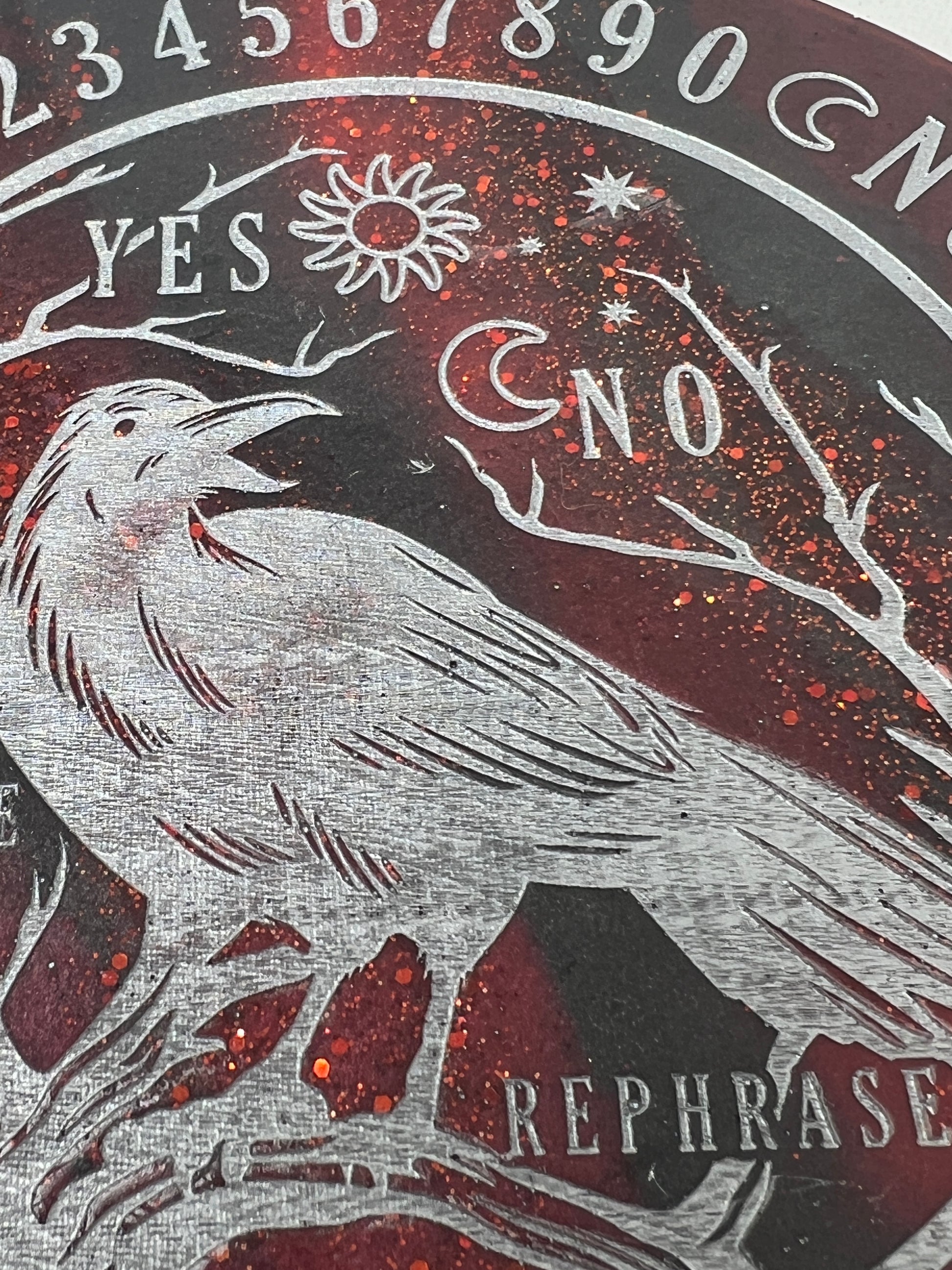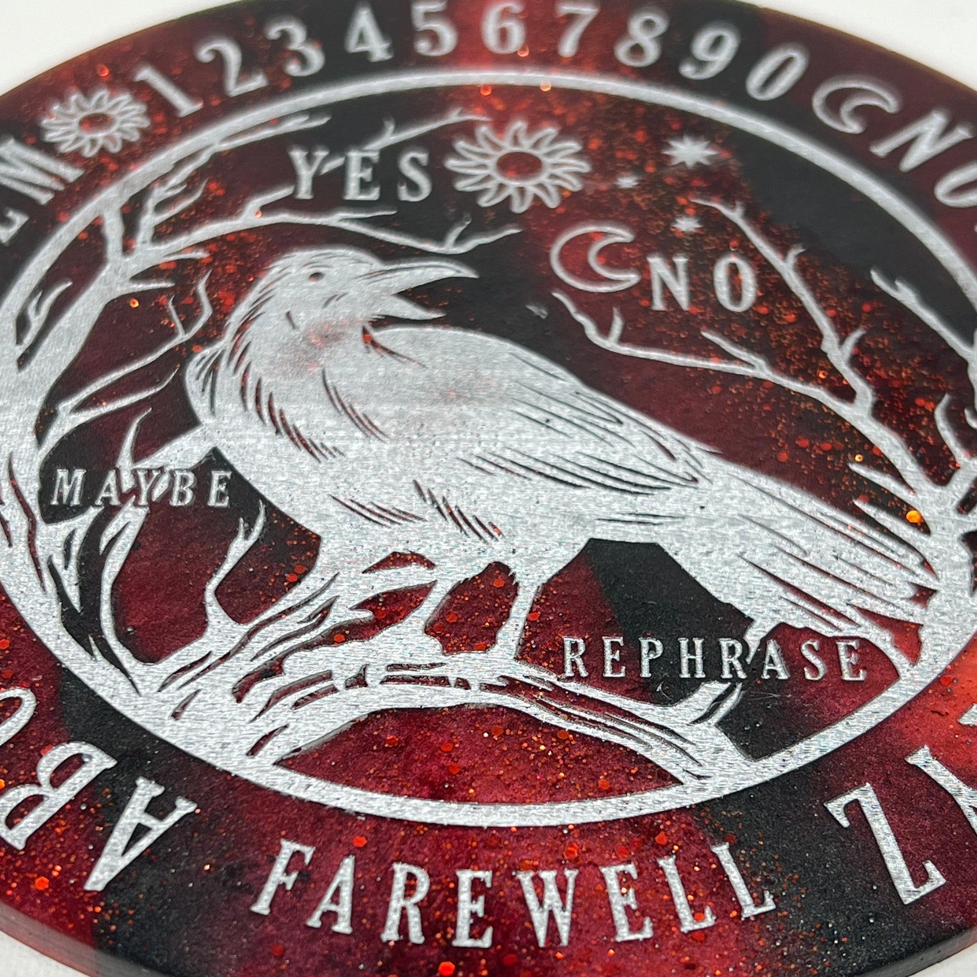 Cloaked in the deep, smoldering tones of a blood moon’s glow, the Blood Moon Raven Spirit Board brings an air of intensity and ancient wisdom to your divination practice. The raven, a guardian of mysteries and messenger from the beyond, perches with a knowing gaze, surrounded by barren branches etched in shimmering silver. Splashes of crimson dance across the board, echoing the energy of lunar cycles and the mysteries they hold. Use this board to dive into the heart of your questions, guided by the raven’s silent strength and the transformative power of the blood moon. Let the whispers of the cosmos come to life as you seek clarity and connection with the unseen.