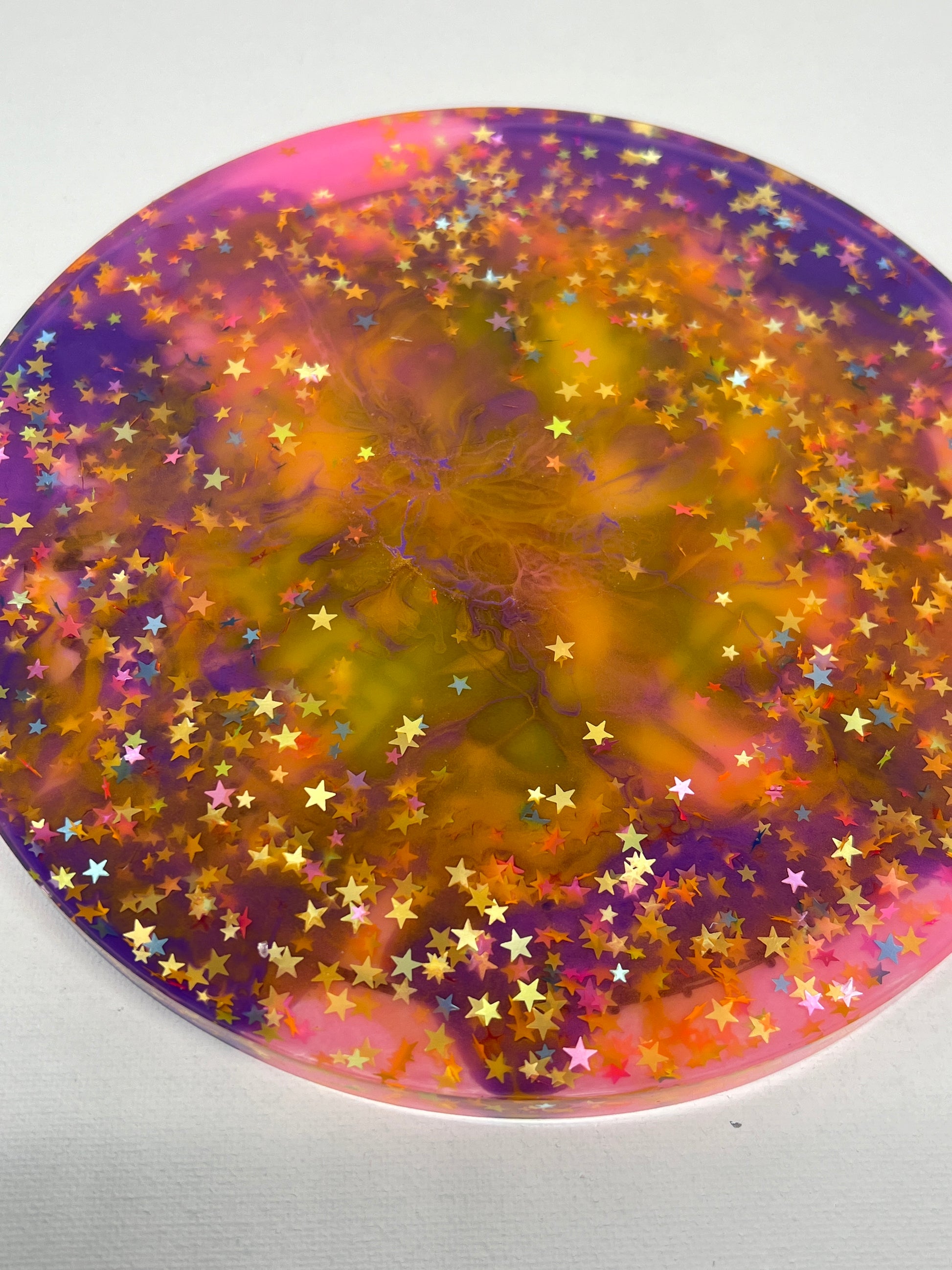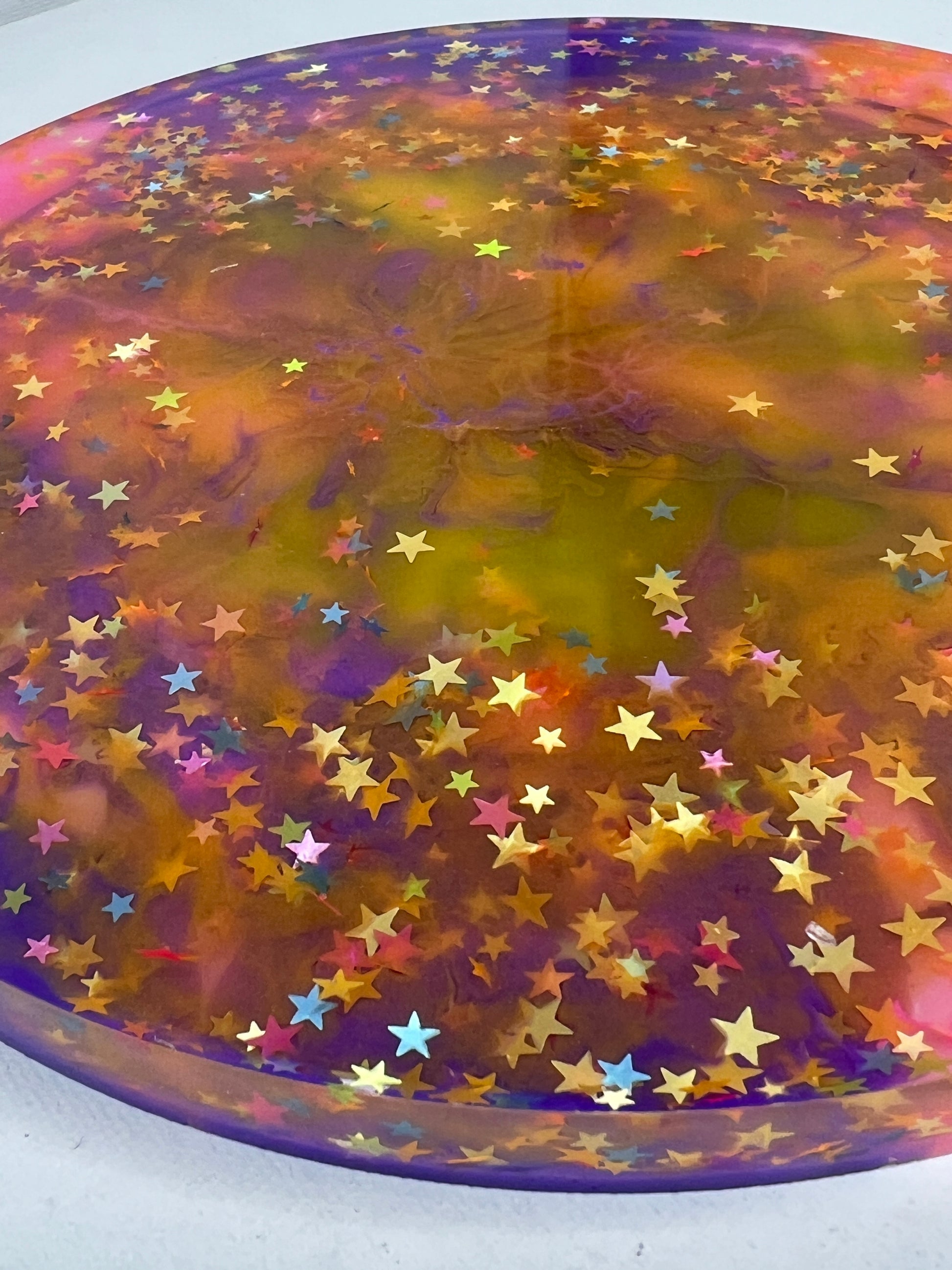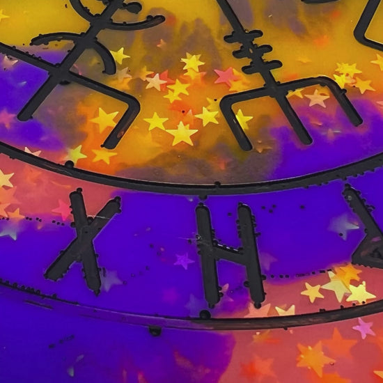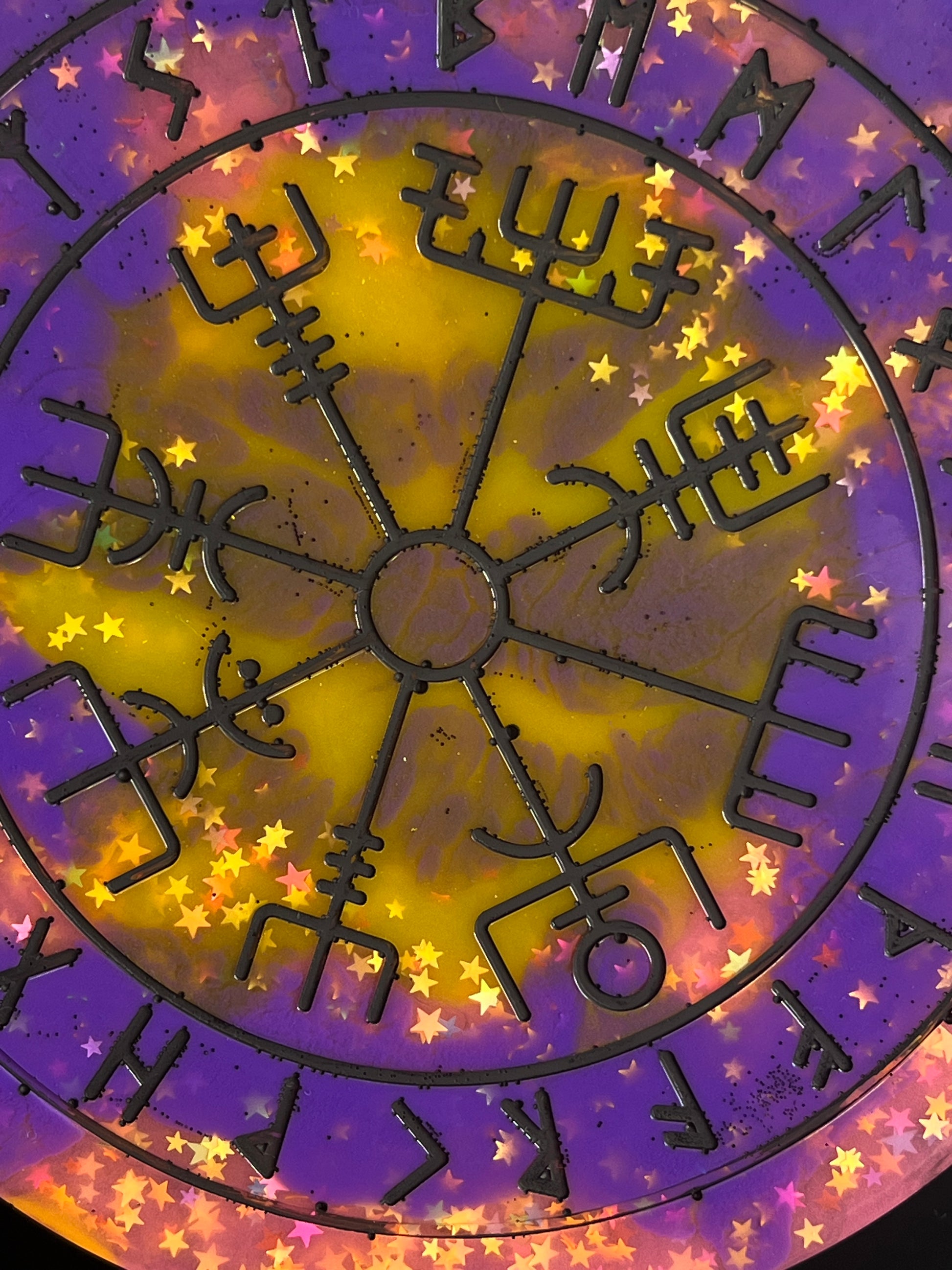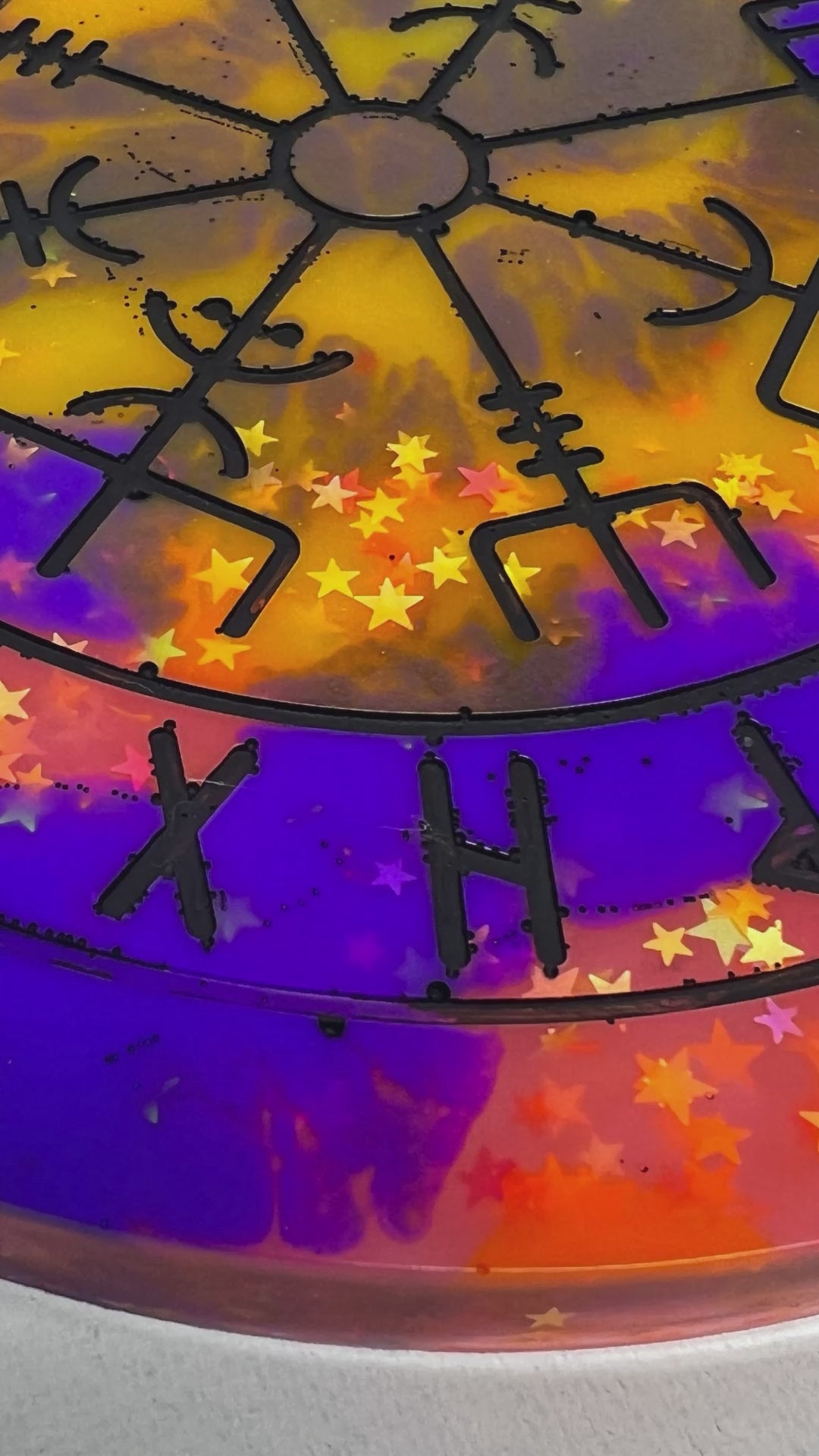 Step into the magic of the night sky with the Celestial Dream Runic Compass Wheel, a luminous blend of cosmic wonder and ancient runic wisdom. Swirled in glowing shades of violet, lavender, gold, and twilight pink — and sprinkled with tiny shimmering stars — this piece radiates pure celestial enchantment.