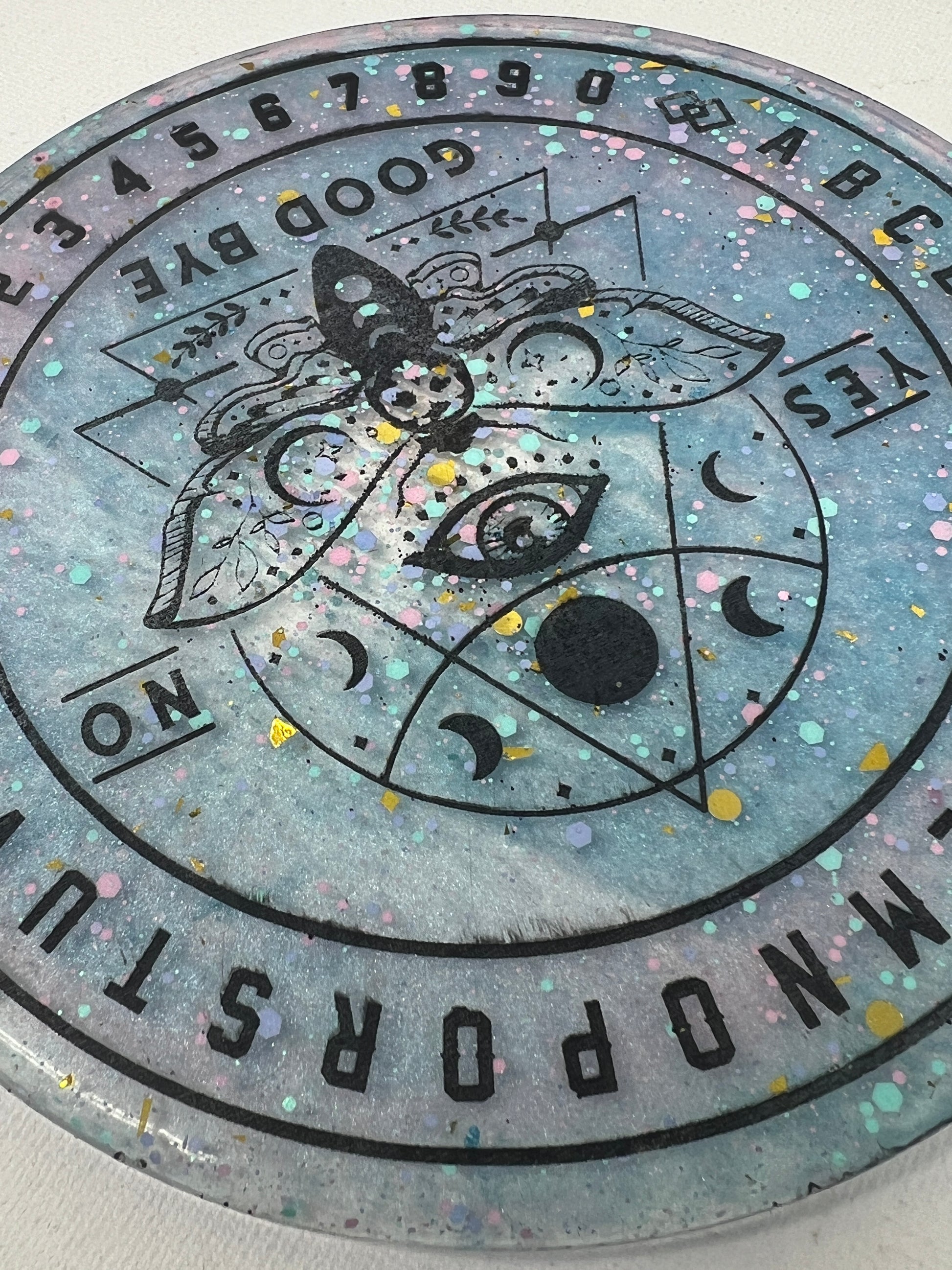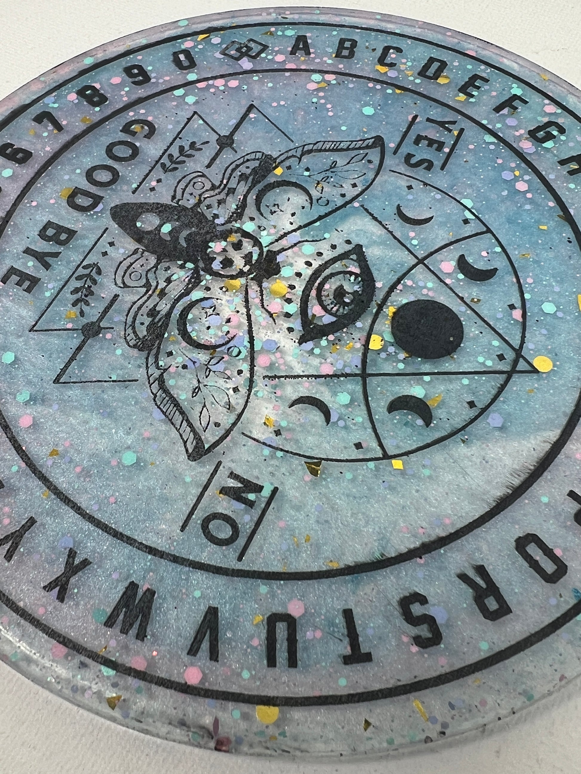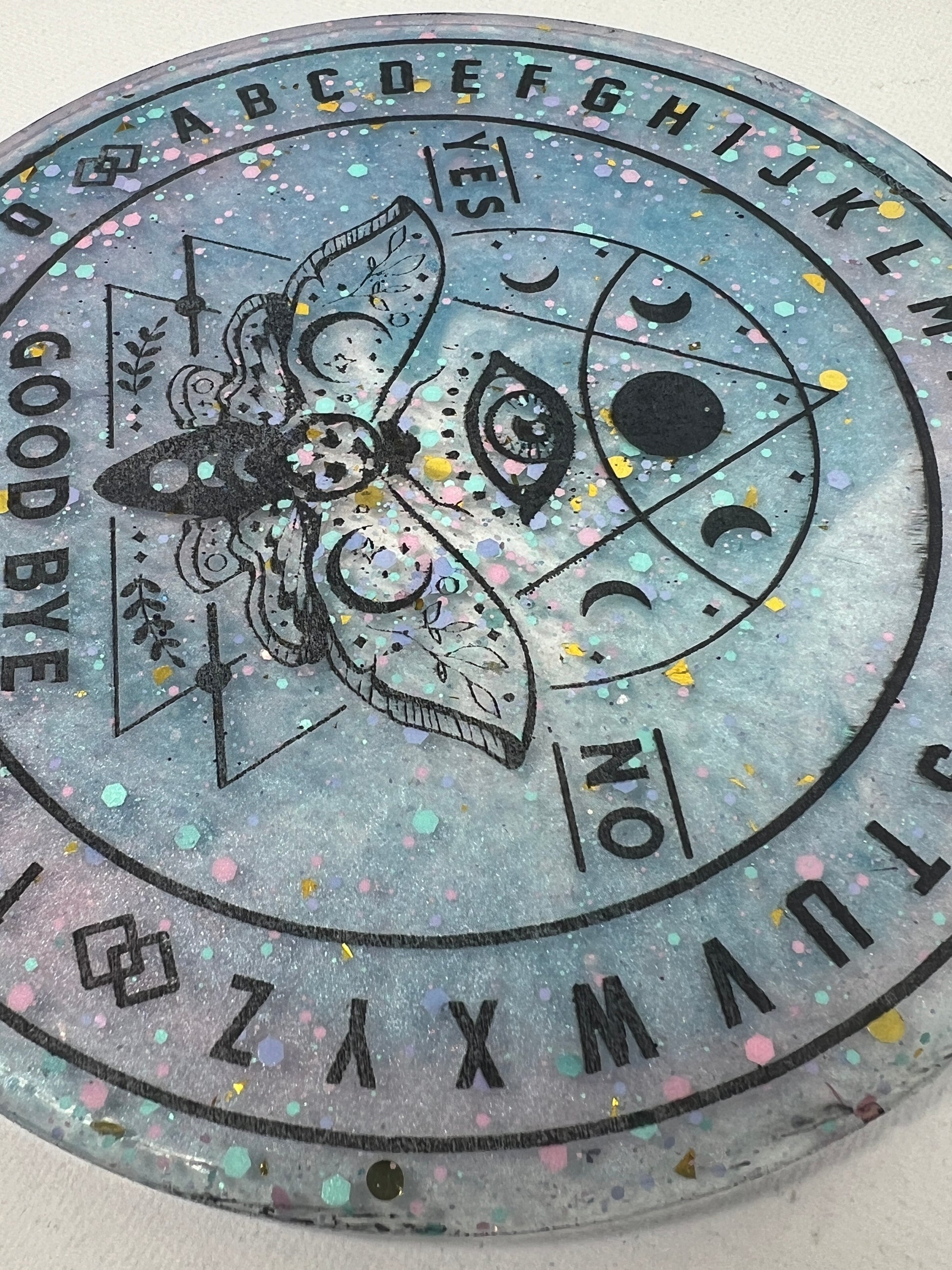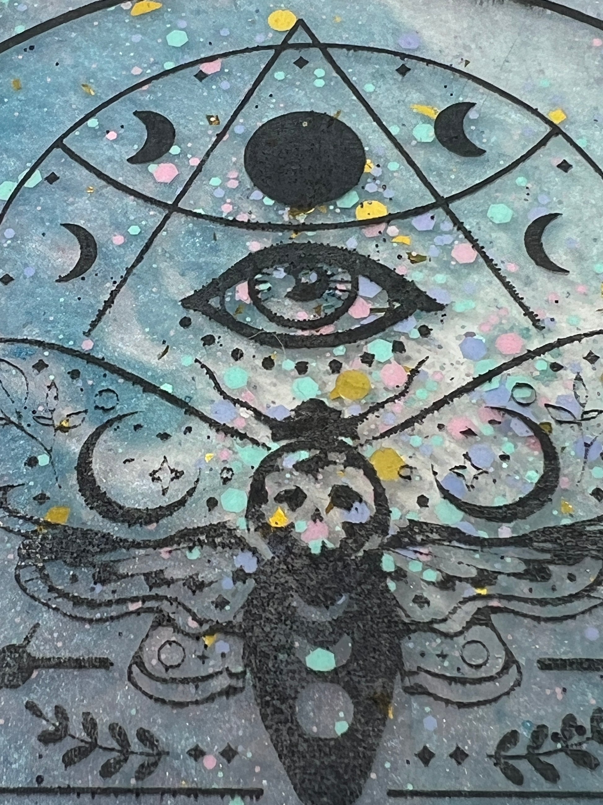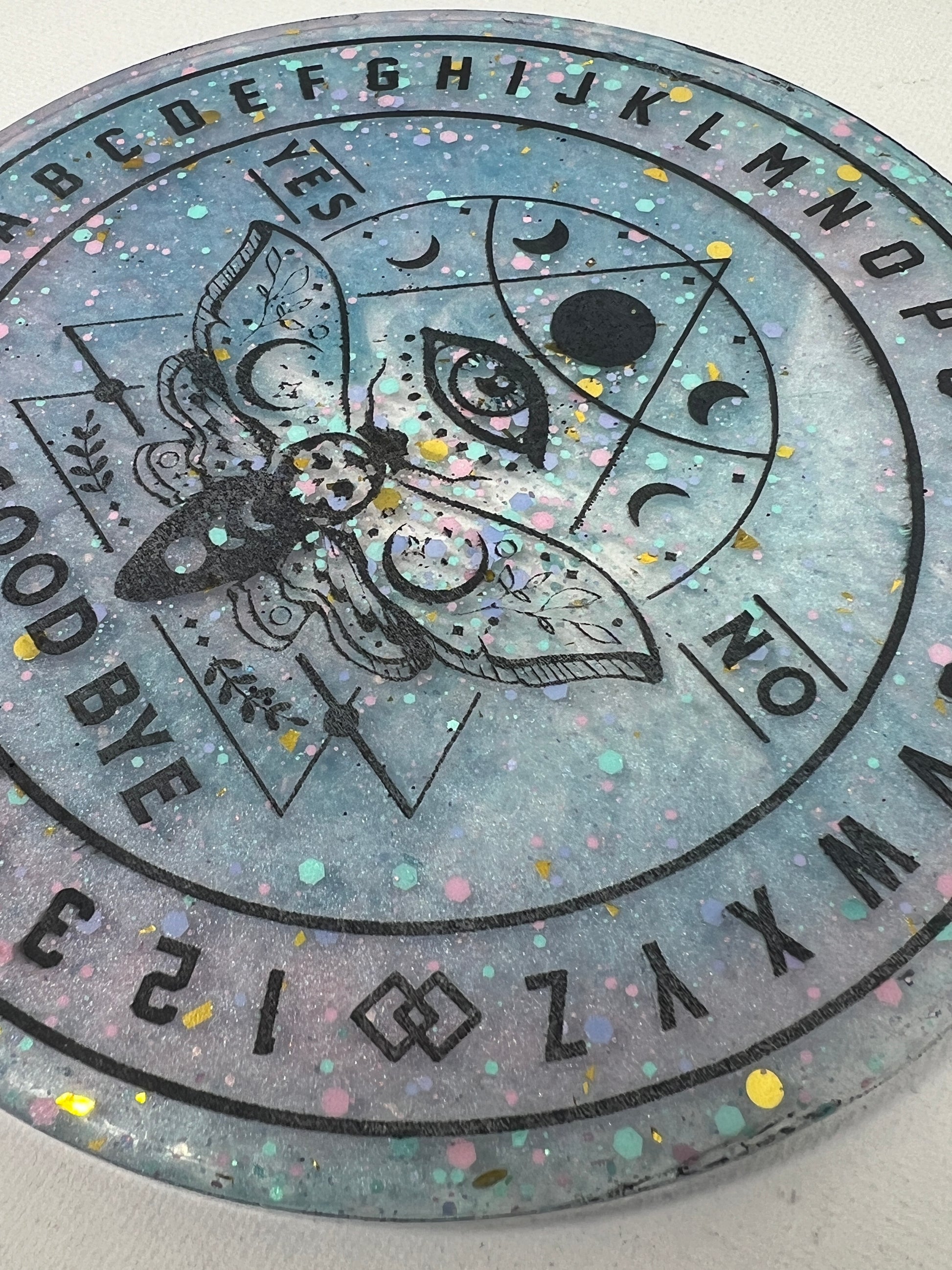 Step into a cosmic dreamscape with the Celestial Dreams Divination Board, where pastel hues and shimmering stardust come together to create a portal to otherworldly realms. Adorned with a watchful all-seeing eye and the ethereal moth, this board invites you to dance with the mysteries of the universe. Speckled with confetti-like stars, it captures the playful magic of the cosmos, making it a beautiful companion for those seeking guidance and enchantment. Let the soft colors and celestial symbols awaken your intuition and uncover the answers that lie in the vast night sky.
