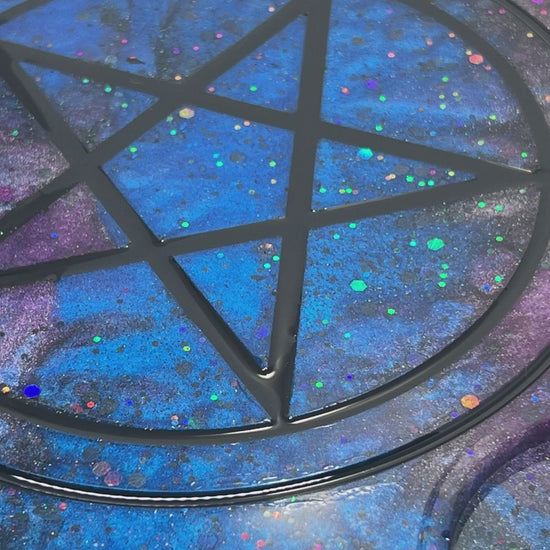 At the center rests a bold black pentacle enclosed in a protective circular ridge, grounding your magic with stability and intention. The galactic background creates a mesmerizing contrast, making the pentacle appear as though it's floating in cosmic energy. Every angle reveals new stars, new colors, and new depths โ a true one-of-a-kind celestial creation.