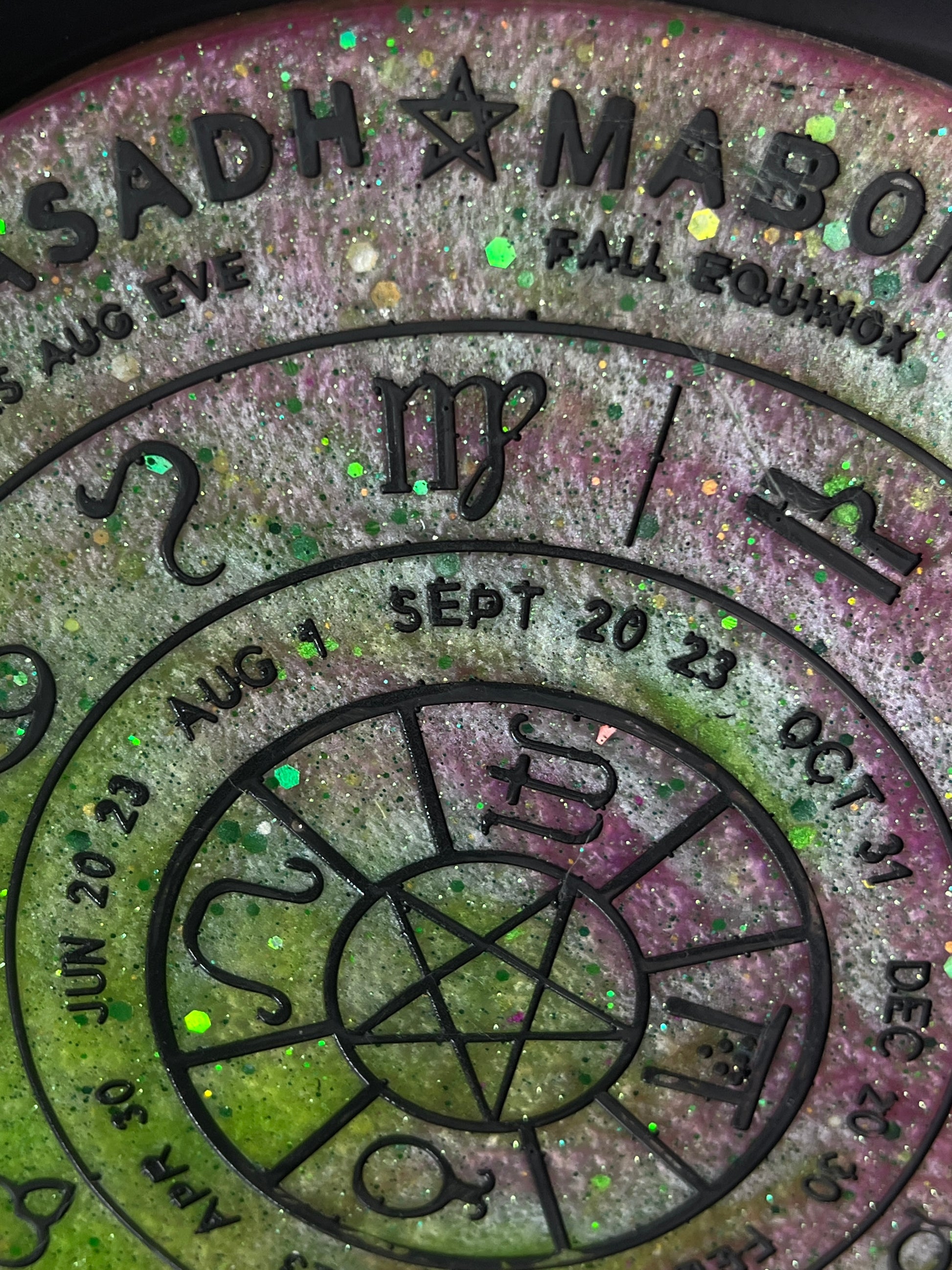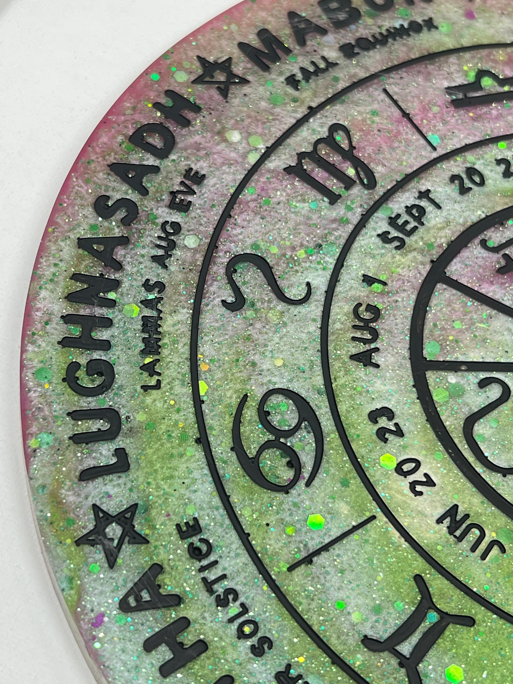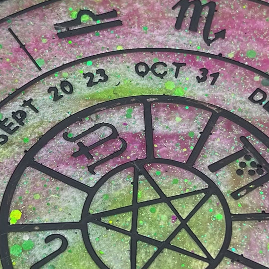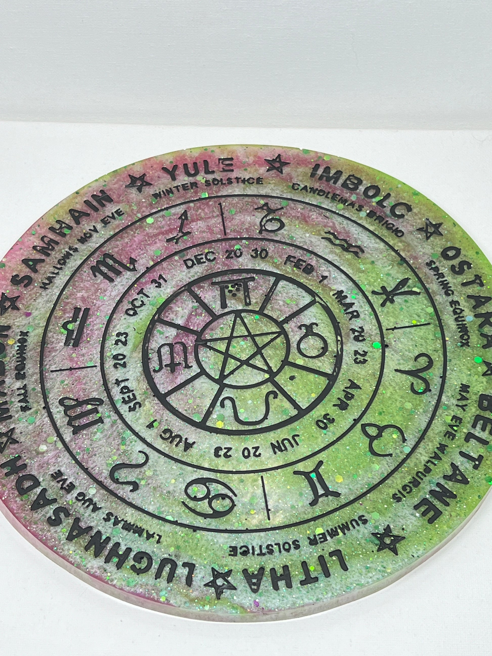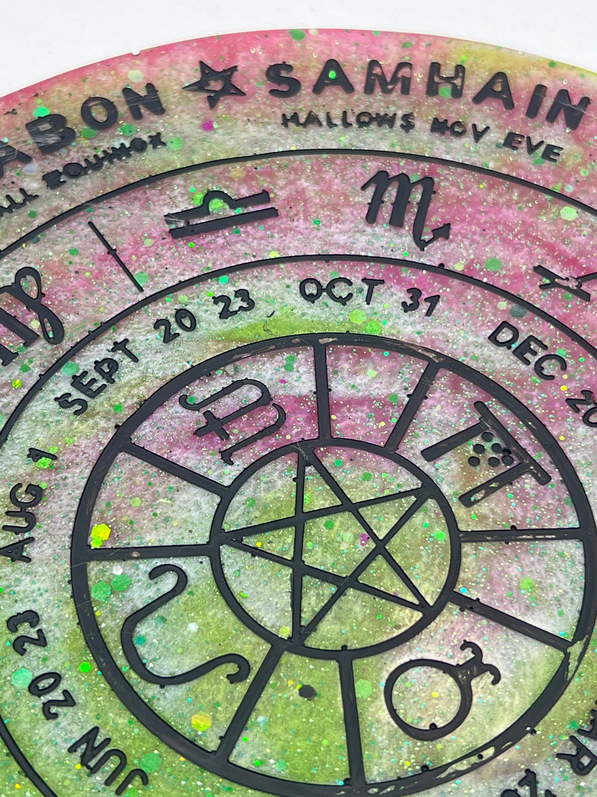 Hand-poured with layers of green, pink, and earthy undertones, the tray is sprinkled with iridescent glitters that catch the light like dewdrops on fresh leaves. The sabbat names—Yule, Imbolc, Ostara, Beltane, Litha, Lughnasadh, Mabon, and Samhain—are etched in bold black lettering, along with zodiac symbols and seasonal dates that guide the ever-turning Wheel. At its heart, a central pentacle grounds the piece with protection, balance, and elemental connection.