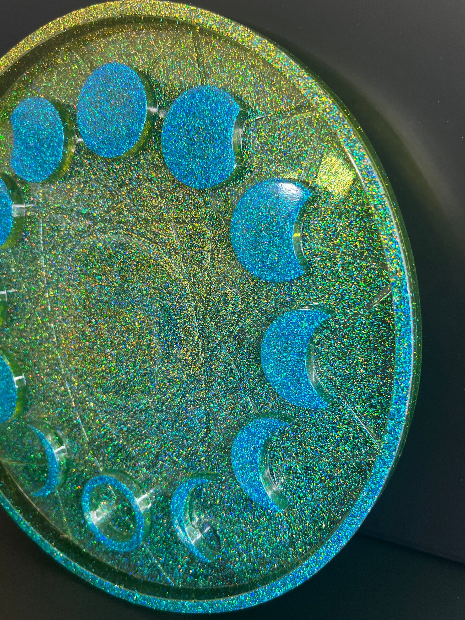 Hand-poured in swirling currents of oceanic green and deep astral blue, this tray glows like moonlight dancing across water. Embedded holographic glitter shifts with every angle, creating a living galaxy beneath your fingertips.