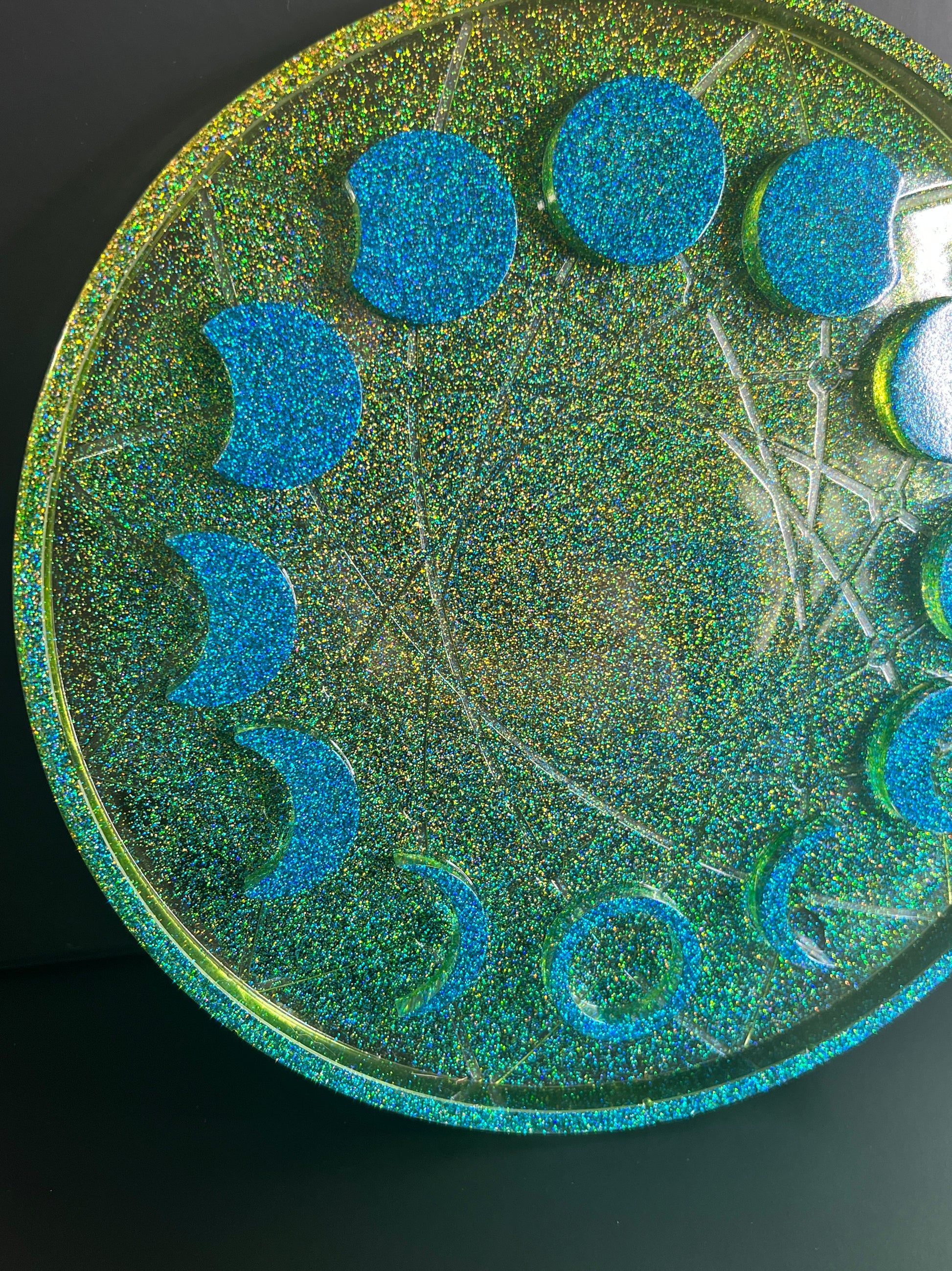 Raised 3-D moon phases circle the tray, symbolizing intention, growth, release, intuition, and rebirth. Each phase is sculpted in a bold, mesmerizing blue sparkle—guiding your eye and your energy around the wheel of transformation.