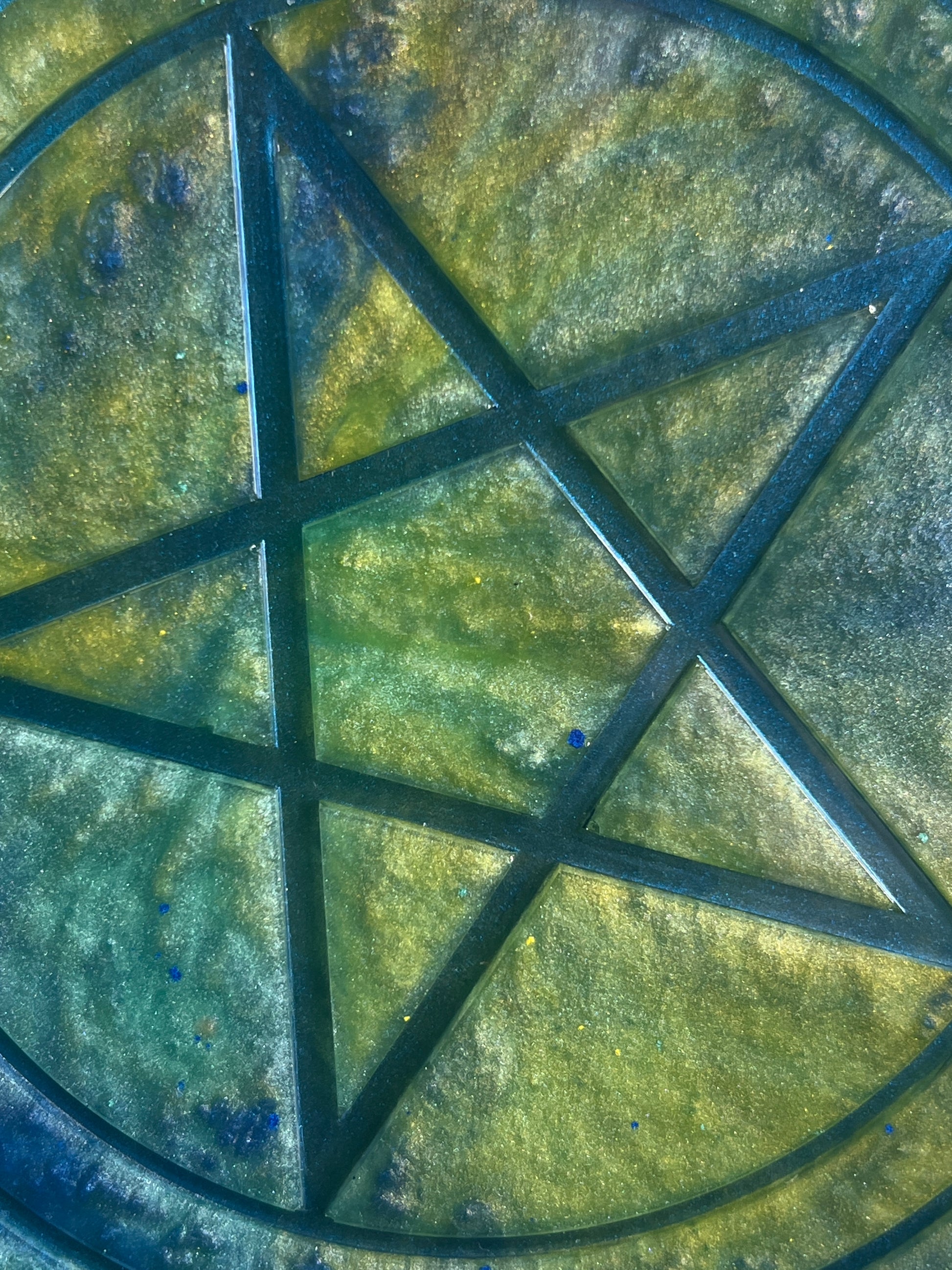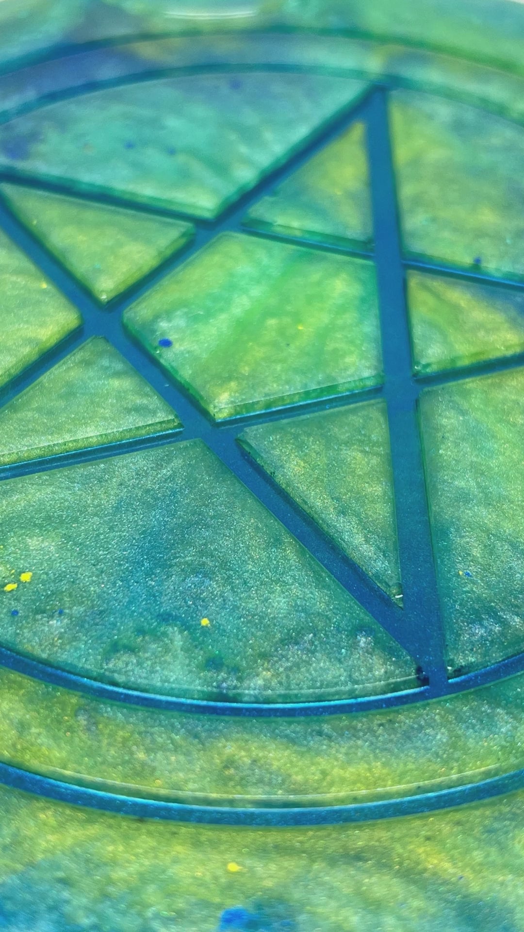 A raised sapphire pentacle rests at the heart of the tray, circled by protective rings that center your candle flame and anchor your intentions. Every swirl of color carries the gentle energy of tides, breezes, and shifting clouds โ making this piece an ideal companion for spellwork tied to healing, balance, and spiritual alignment.