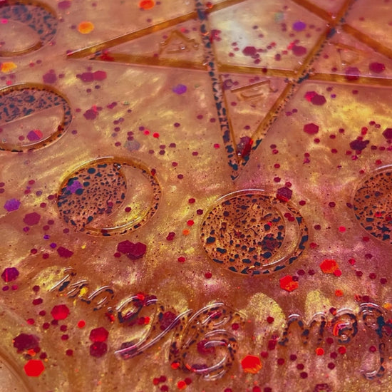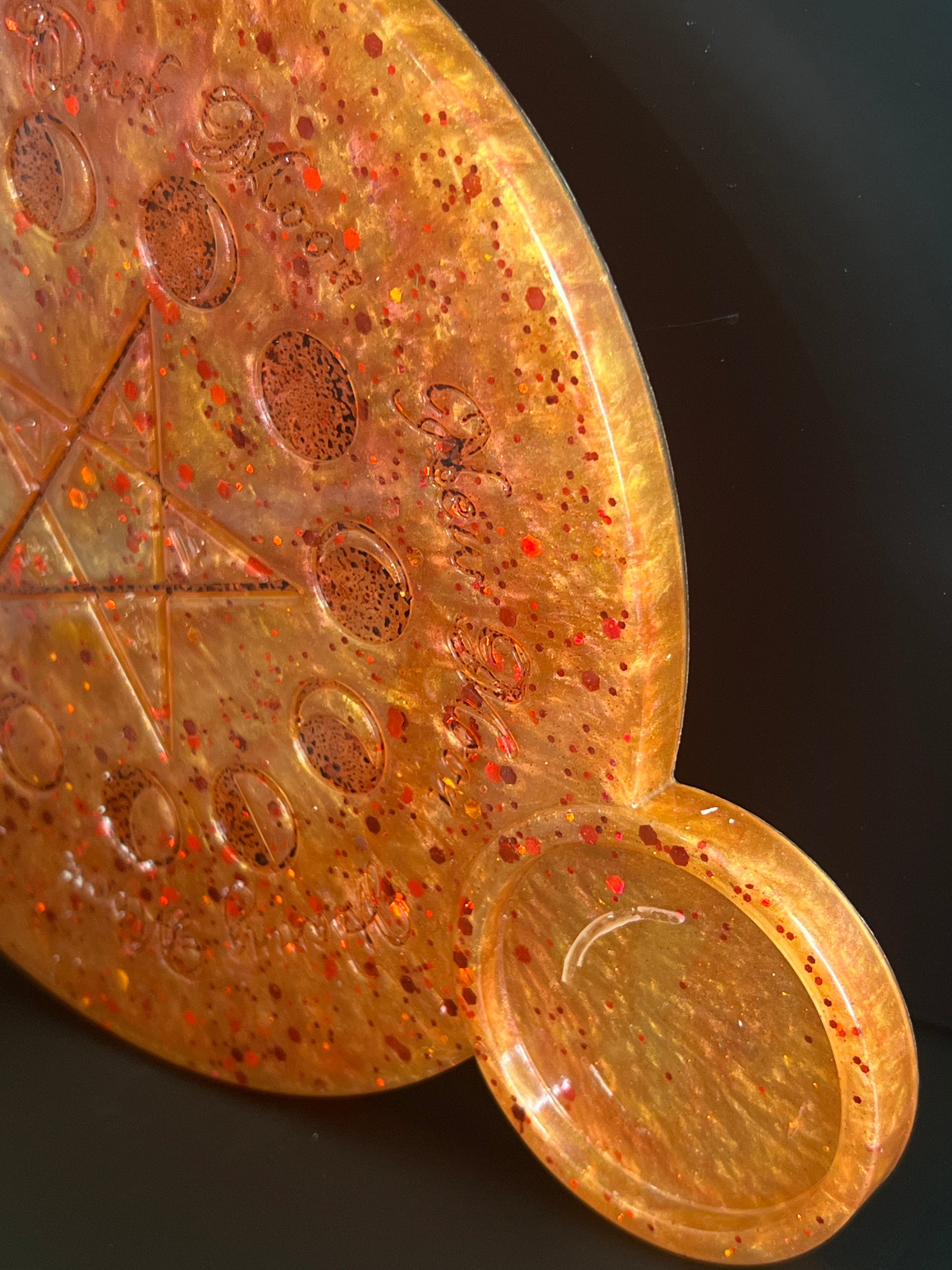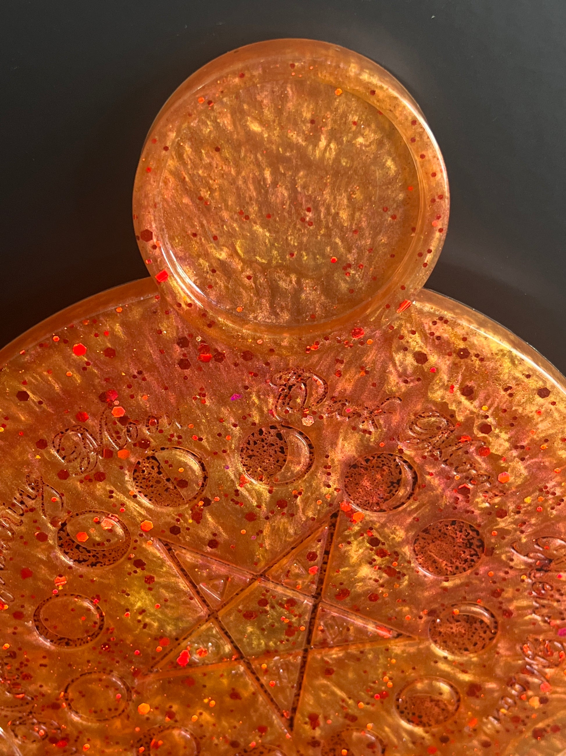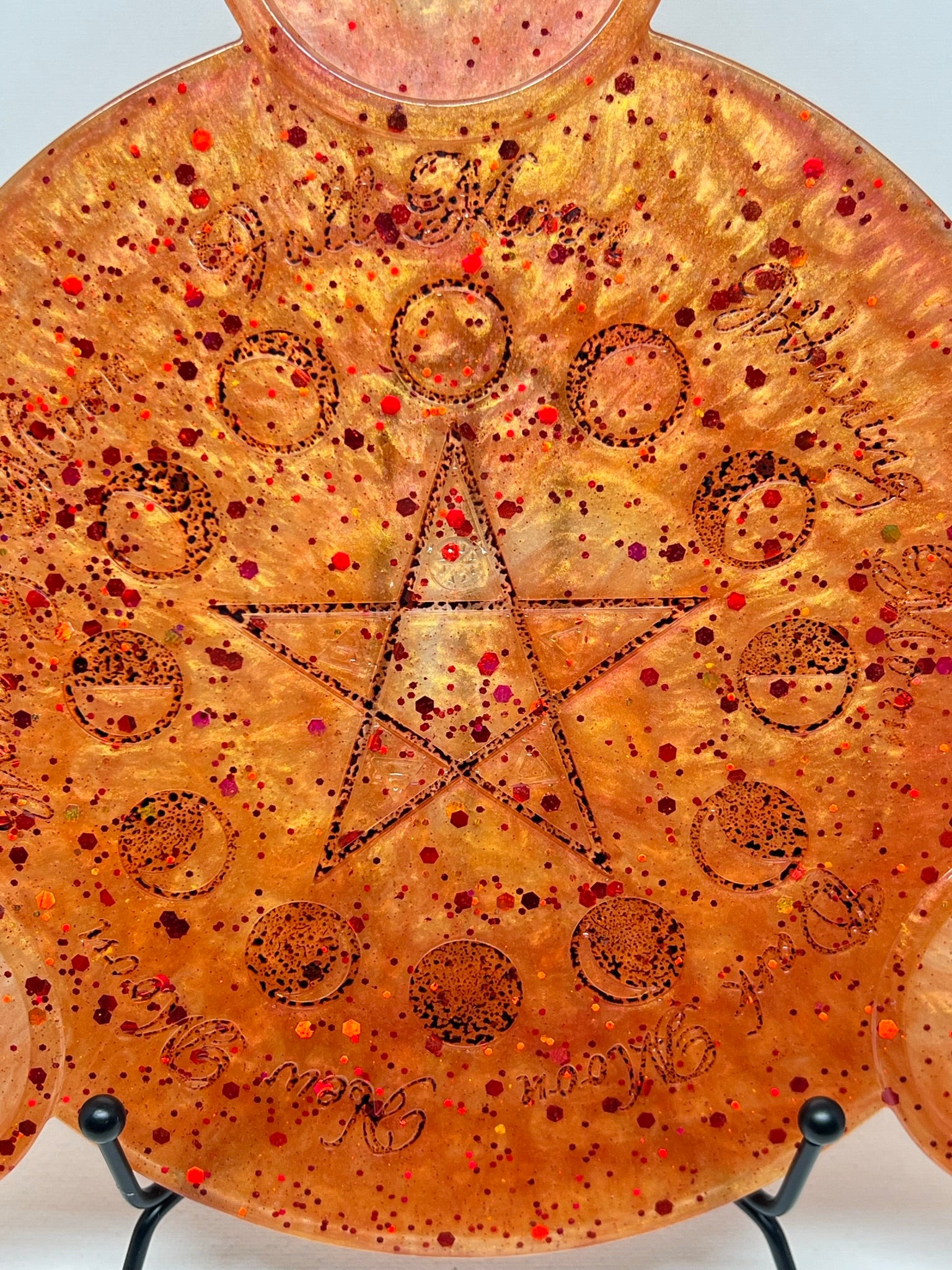 A raised copper-toned pentacle sits at the heart of the tray, surrounded by a complete wheel of moon phases etched in coordinating fire-kissed lettering. This design bridges the steady wisdom of the moon with the fierce spark of fire magic—inviting you to plant intentions, release what no longer serves, and manifest with confidence and clarity.