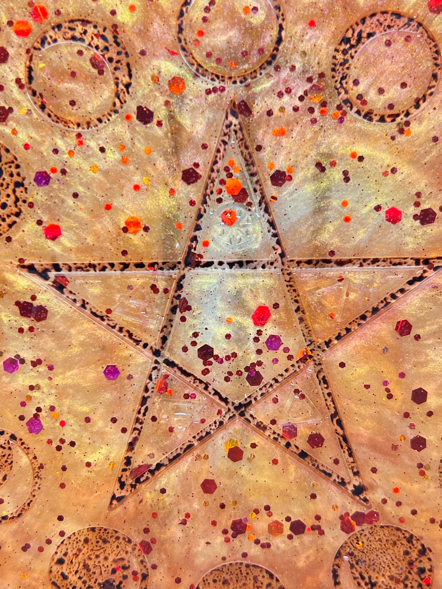 Three matching offering dishes complete this magical piece, perfect for holding herbs, oils, incense cones, crystals, or spell ingredients as your candle burns at the center of your ritual. The shimmering layers and scattered ember-like sparkles make every angle feel alive and powerful.
