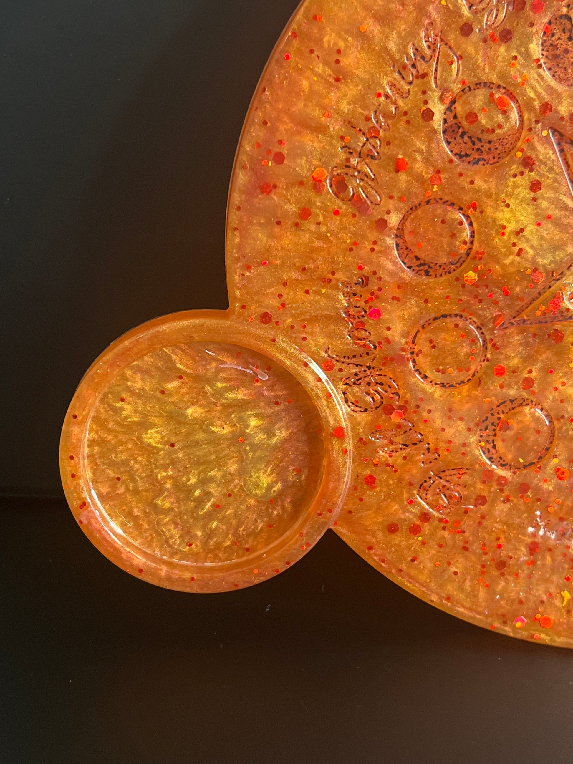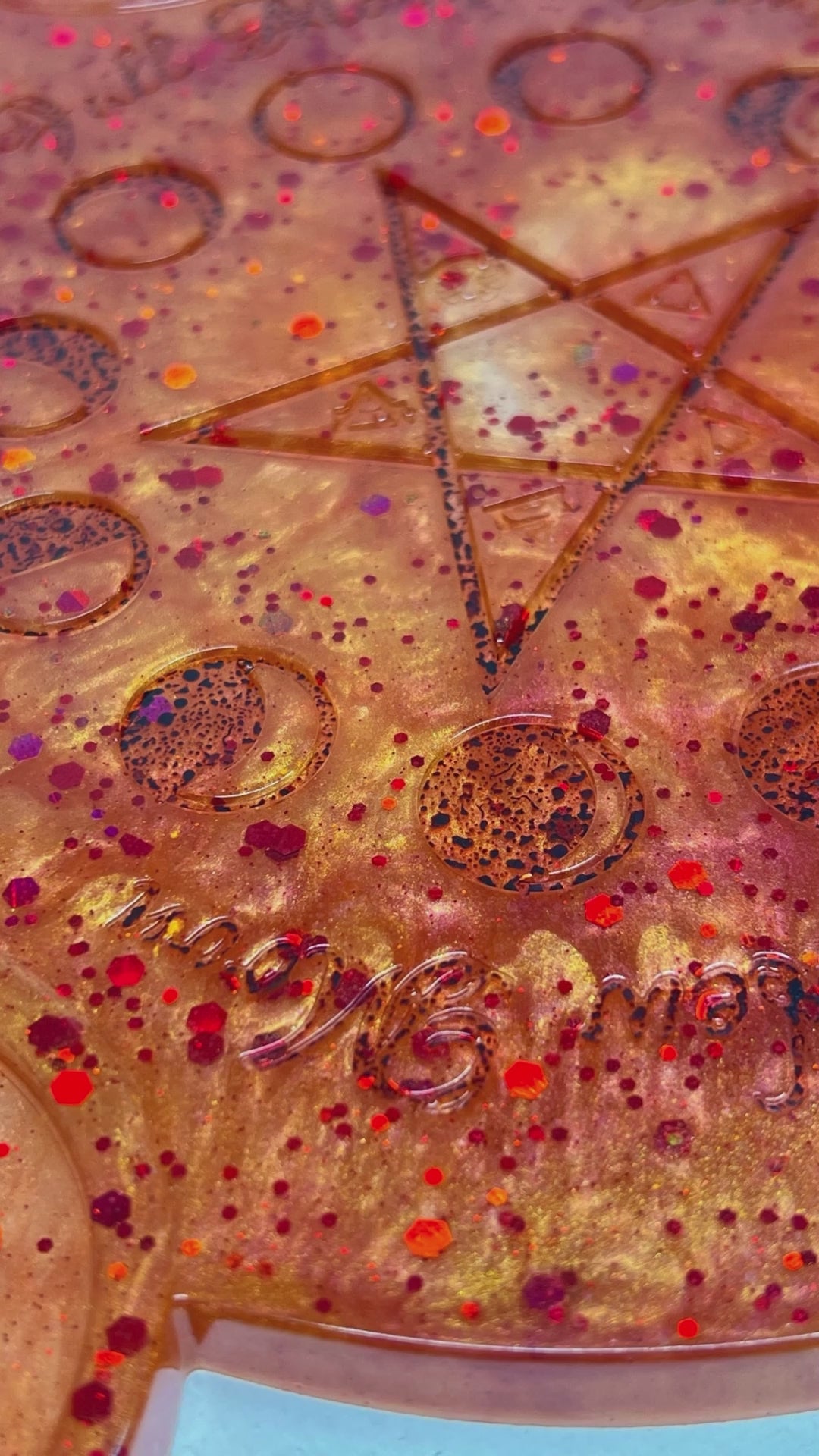 Warm your altar with the glowing energy of fire, harvest, and transformation. This Harvest Ember Moon-Phase Ritual Altar Candle Tray is hand-poured in rich hues of molten copper, pumpkin orange, and golden amber, flecked with glowing red and orange glitter that sparkles like embers rising from a ritual bonfire. Its warm, autumnal aura makes it an empowering tool for spells of courage, abundance, protection, and renewal.