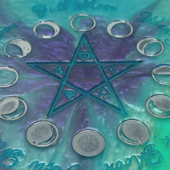 A raised teal pentacle sits at the heart of the tray, surrounded by a complete silver moon-phase wheel โ guiding your intentions through every stage of the lunar cycle. The etched words for each phase offer clarity during ritual work, whether youโre manifesting under the New Moon, cleansing during the Waning Moon, or releasing under the Full Moon.