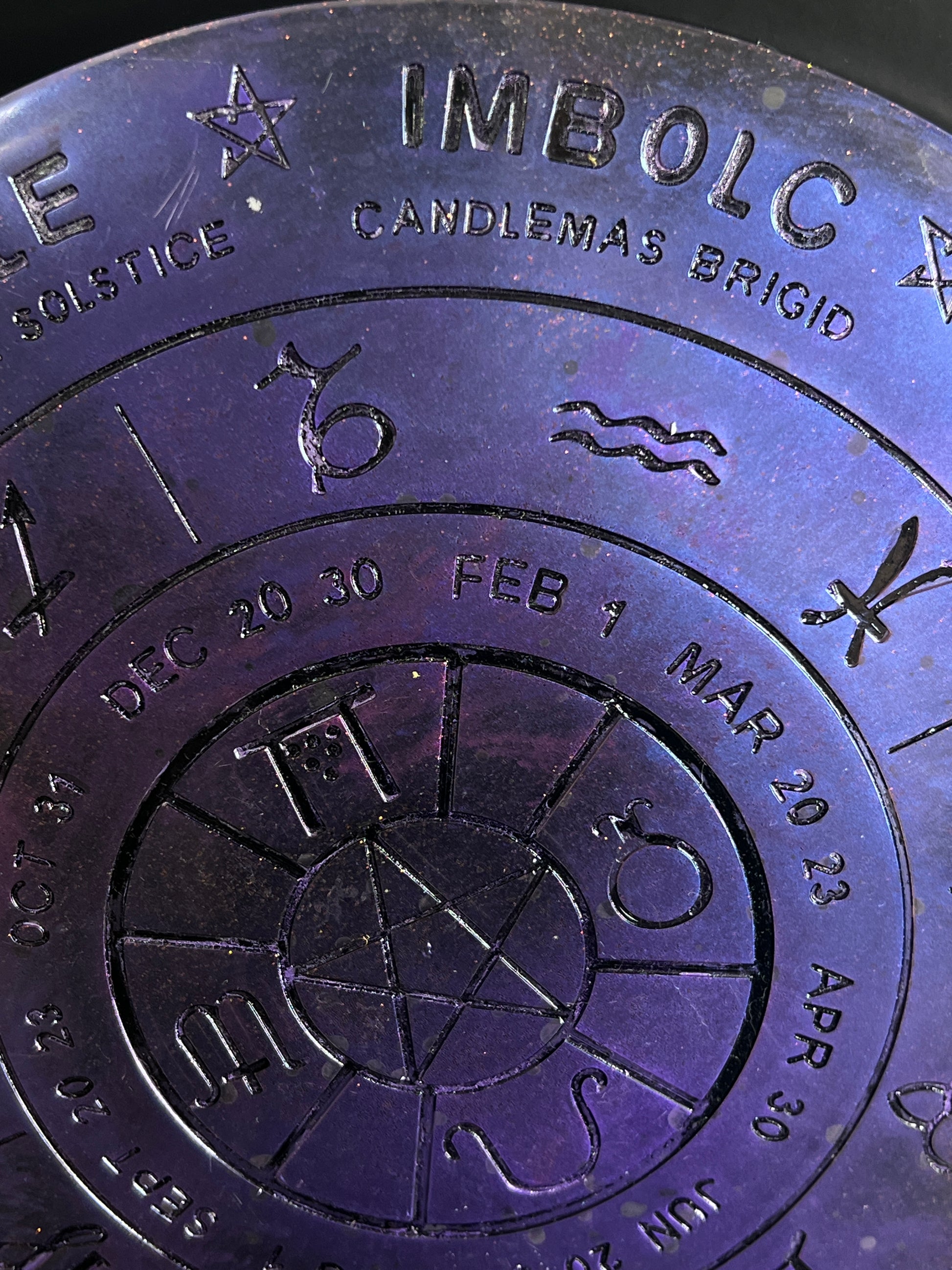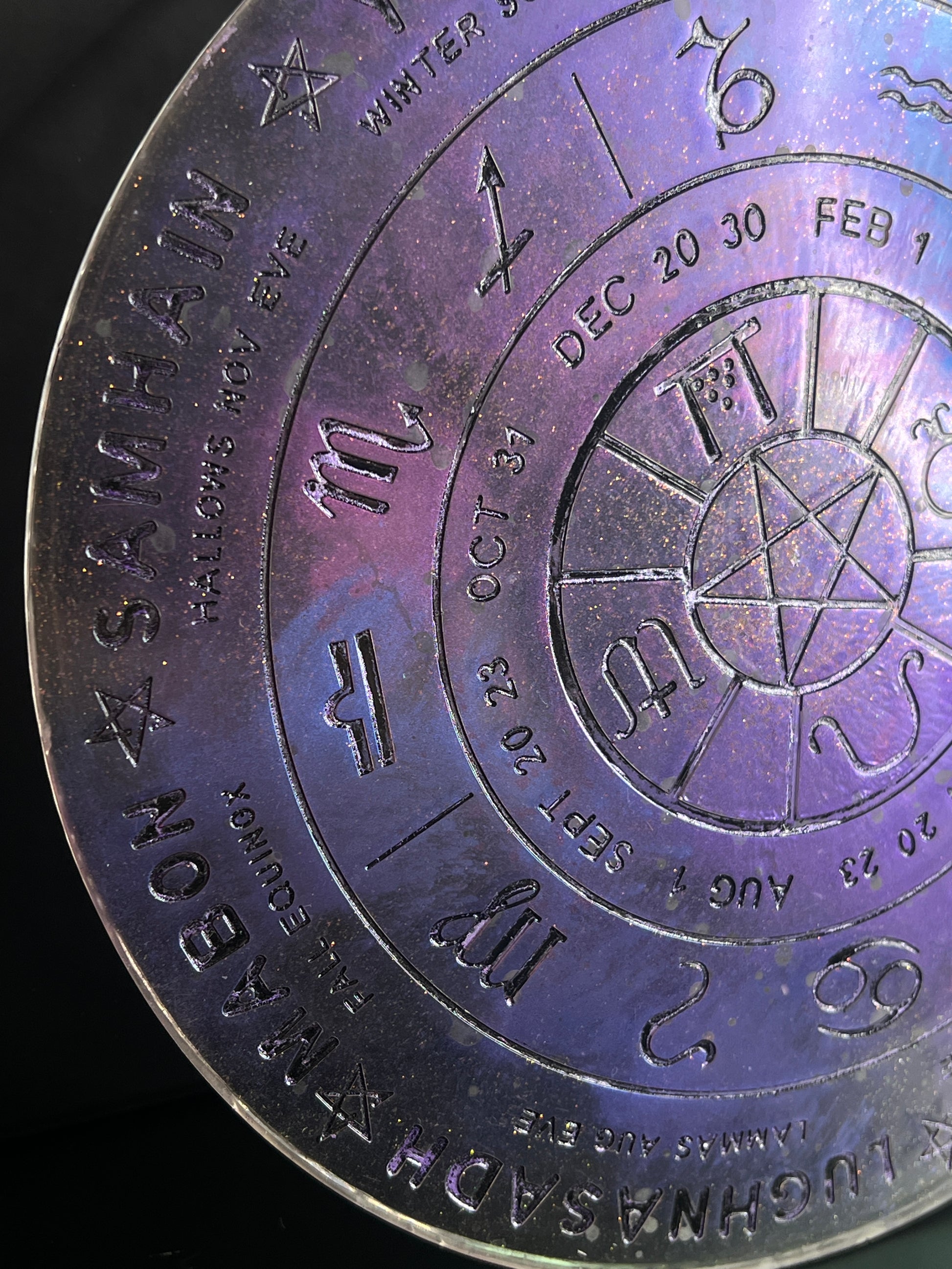 Etched around the wheel are the eight sacred sabbats—Yule, Imbolc, Ostara, Beltane, Litha, Lughnasadh, Mabon, and Samhain—paired with the zodiac transitions that guide the turning seasons. At the heart of the tray rests a protective pentacle, anchoring your spellwork with grounding, balance, and elemental harmony.