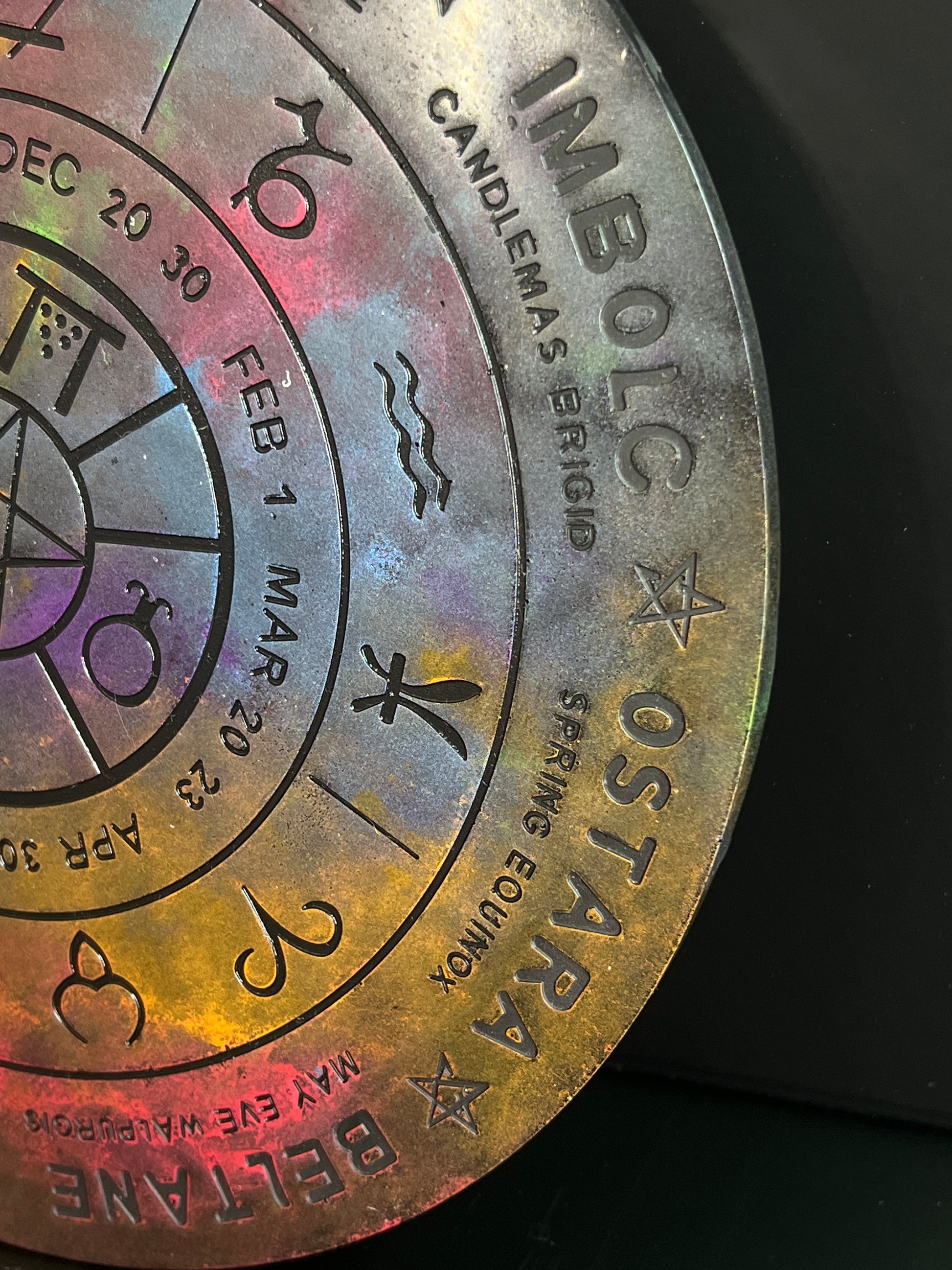 Encircling the tray are the eight sabbats of the Wheel of the Year—Yule, Imbolc, Ostara, Beltane, Litha, Lughnasadh, Mabon, and Samhain—paired with zodiac signs and important seasonal dates. At its center, a grounding pentacle anchors your magic with balance, protection, and elemental harmony.
