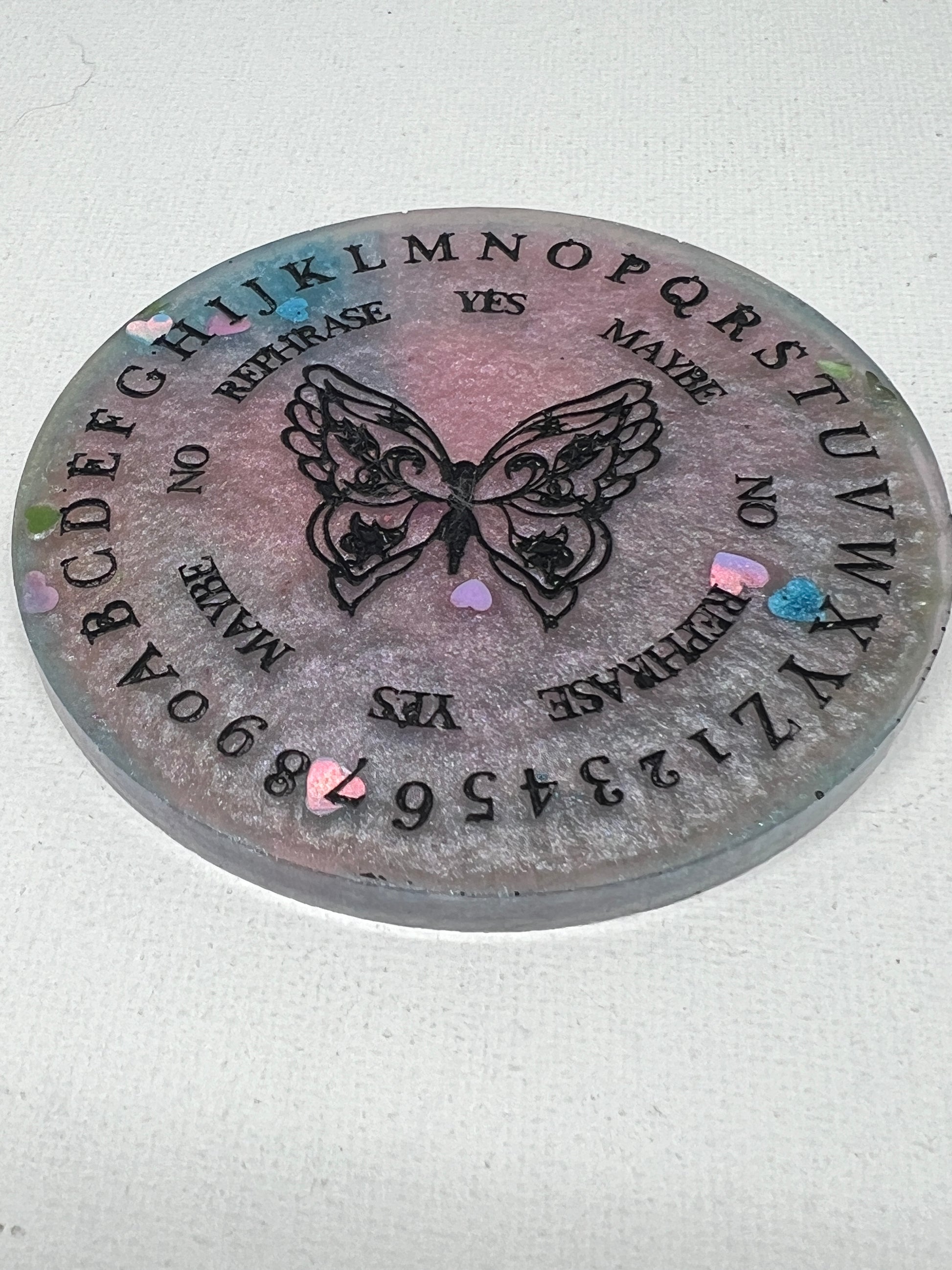 This 3-inch Butterfly Talking Board is a gentle companion for moments of emotional clarity and heart-led reflection. Cast in soft blush pinks with pearlescent shimmer and sprinkled with pastel heart accents, this piece carries a tender, reassuring energy — perfect for questions rooted in healing, self-love, and personal evolution.