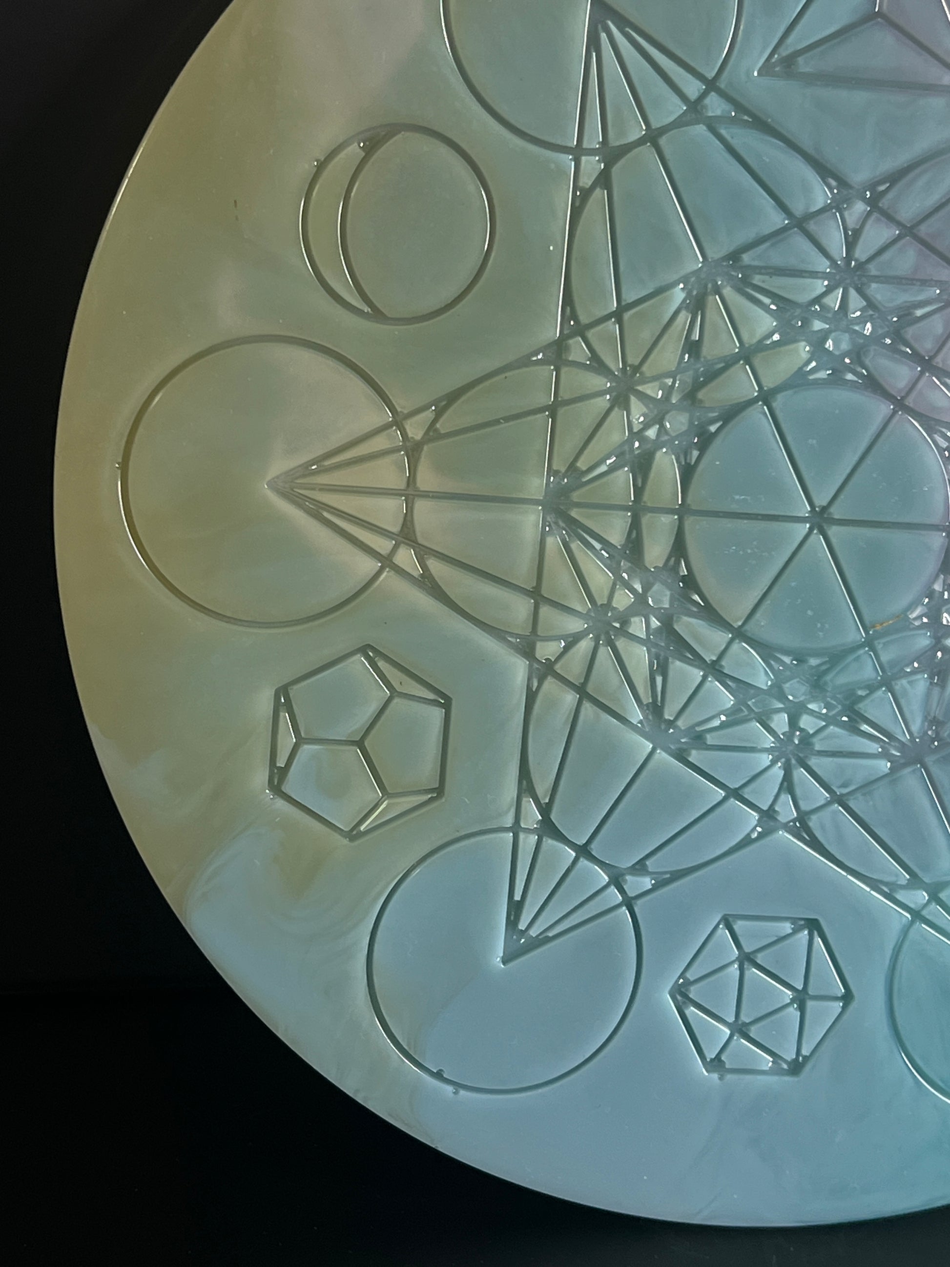 Soft hues of rose quartz pink, celestial blue, seafoam green, and golden dawn melt seamlessly into one another, forming a tranquil gradient reminiscent of first light breaking over a quiet horizon. Within this calming aura, the etched lines of Metatron’s Cube and the Platonic Solids appear like sacred patterns emerging through mist — subtle, harmonious, and deeply aligned with the energy of new beginnings.