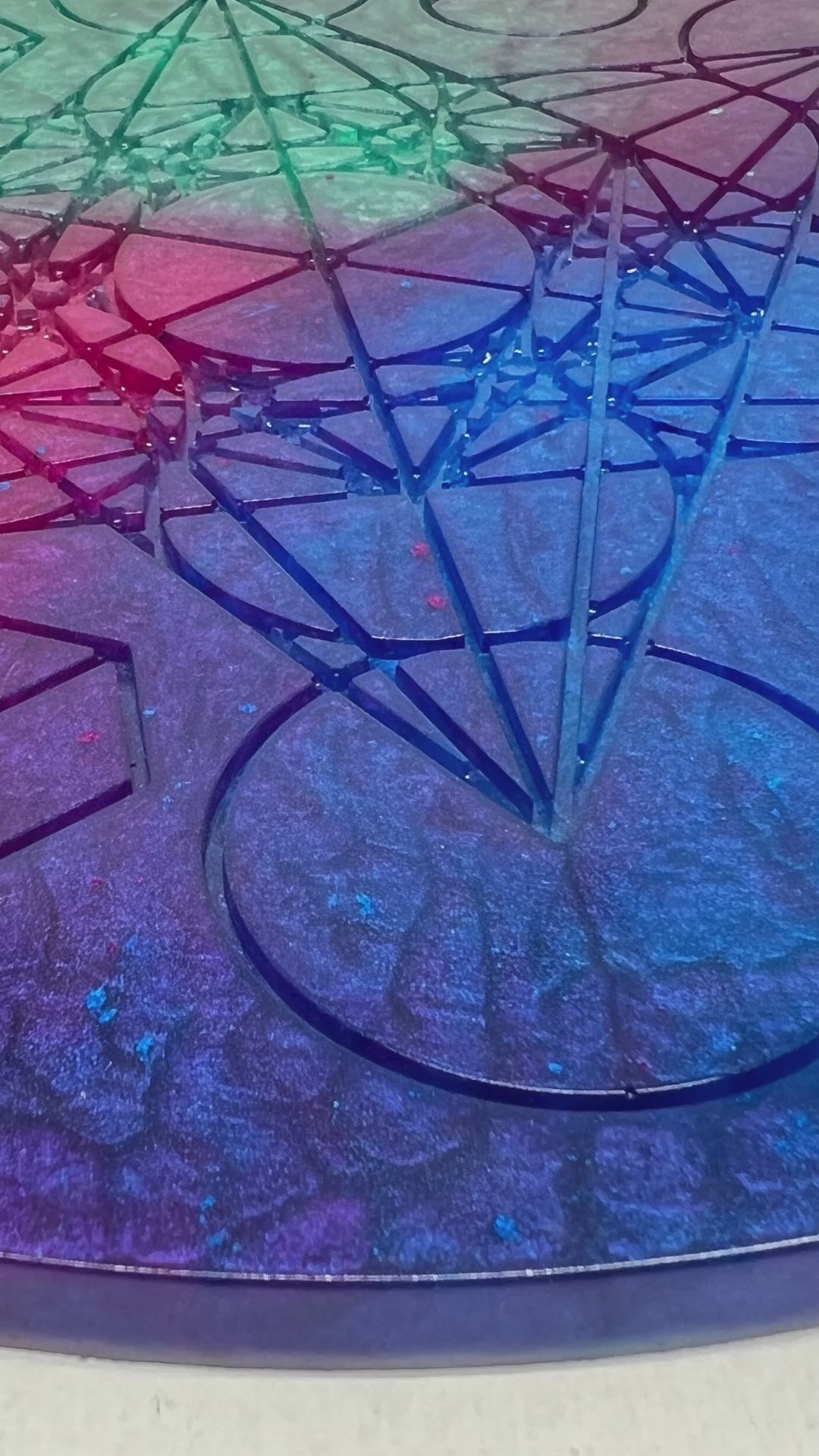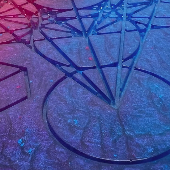 Vivid waves of teal, magenta, violet, and deep ocean blue flow seamlessly across the surface, creating a cosmic gradient that feels both otherworldly and grounding. Cracked-texture veining gives the piece a meteorite-like finish—ancient, mysterious, and full of story. Etched into the swirling colors, the sacred lines of Metatron’s Cube and the Platonic Solids reveal themselves like hidden constellations waiting to be activated.