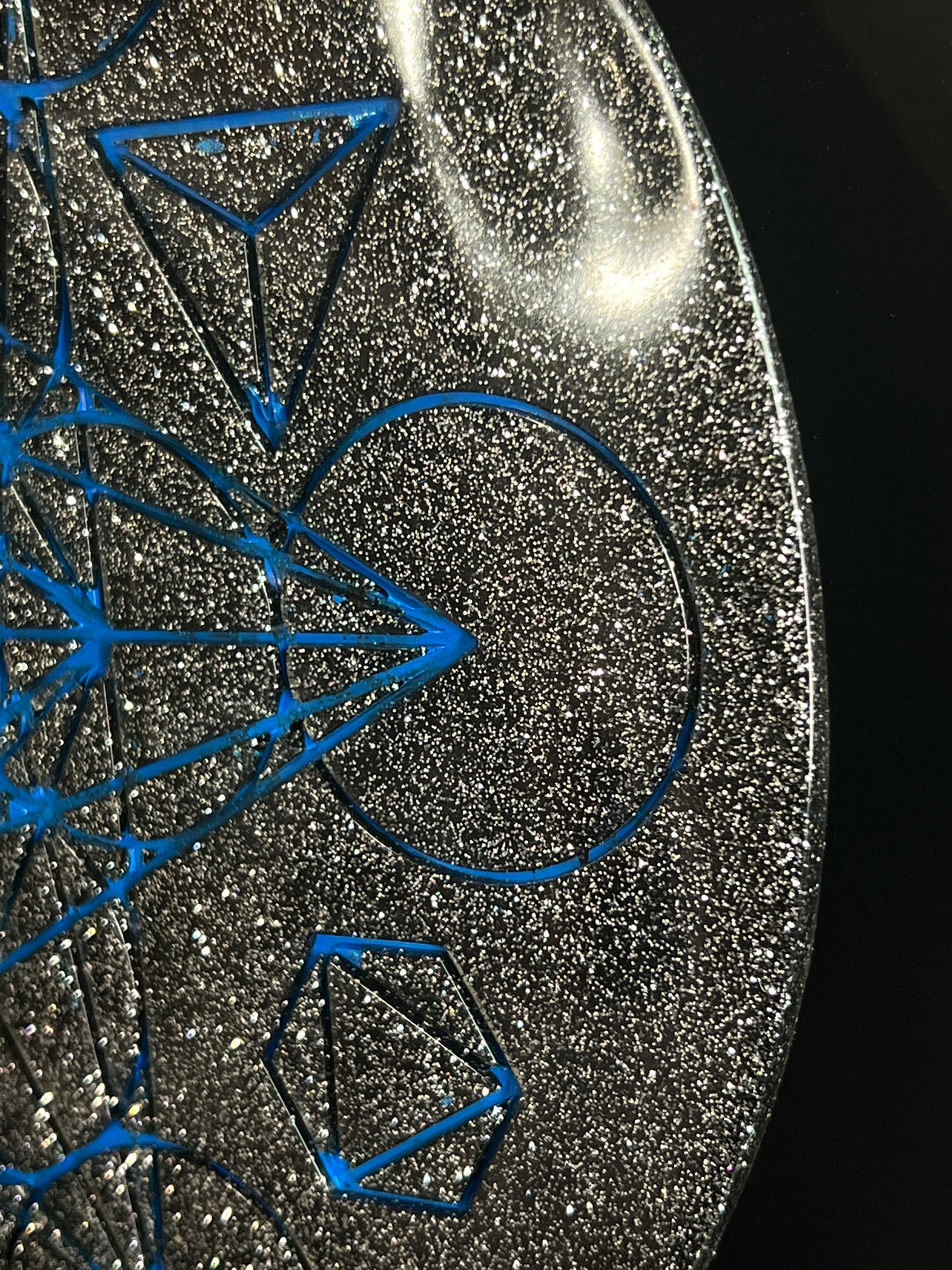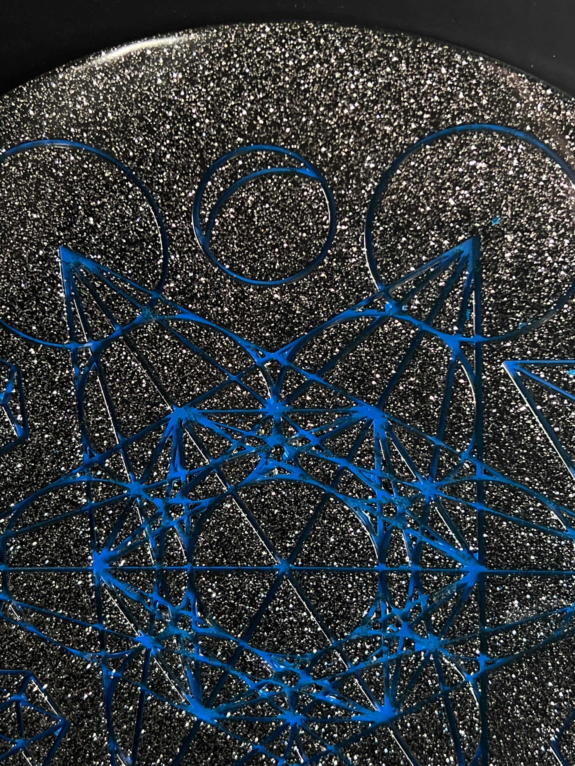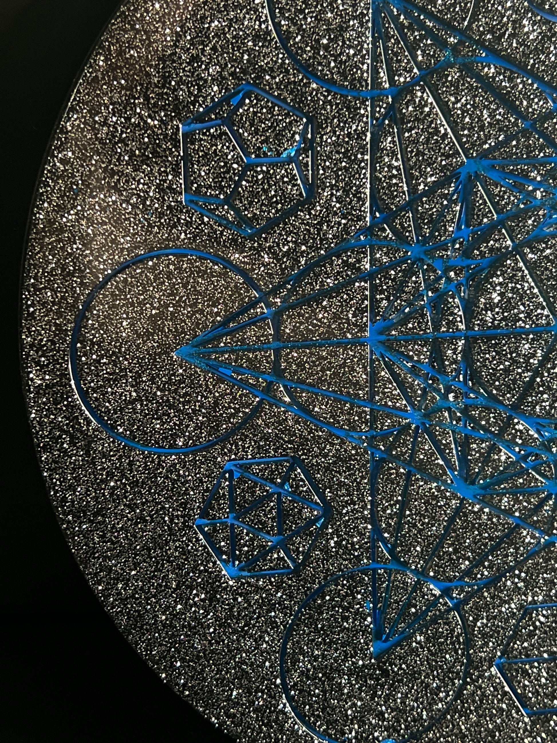 A brilliant field of silver glitter spreads across the surface like a galaxy of distant stars, catching light with every movement. Etched atop this cosmic shimmer, vibrant electric-blue lines form Metatron’s Cube and the Platonic Solids — symbols of creation, structure, balance, and divine intelligence. The contrast is mesmerizing: cool, luminous geometry set against a sparkling night sky.