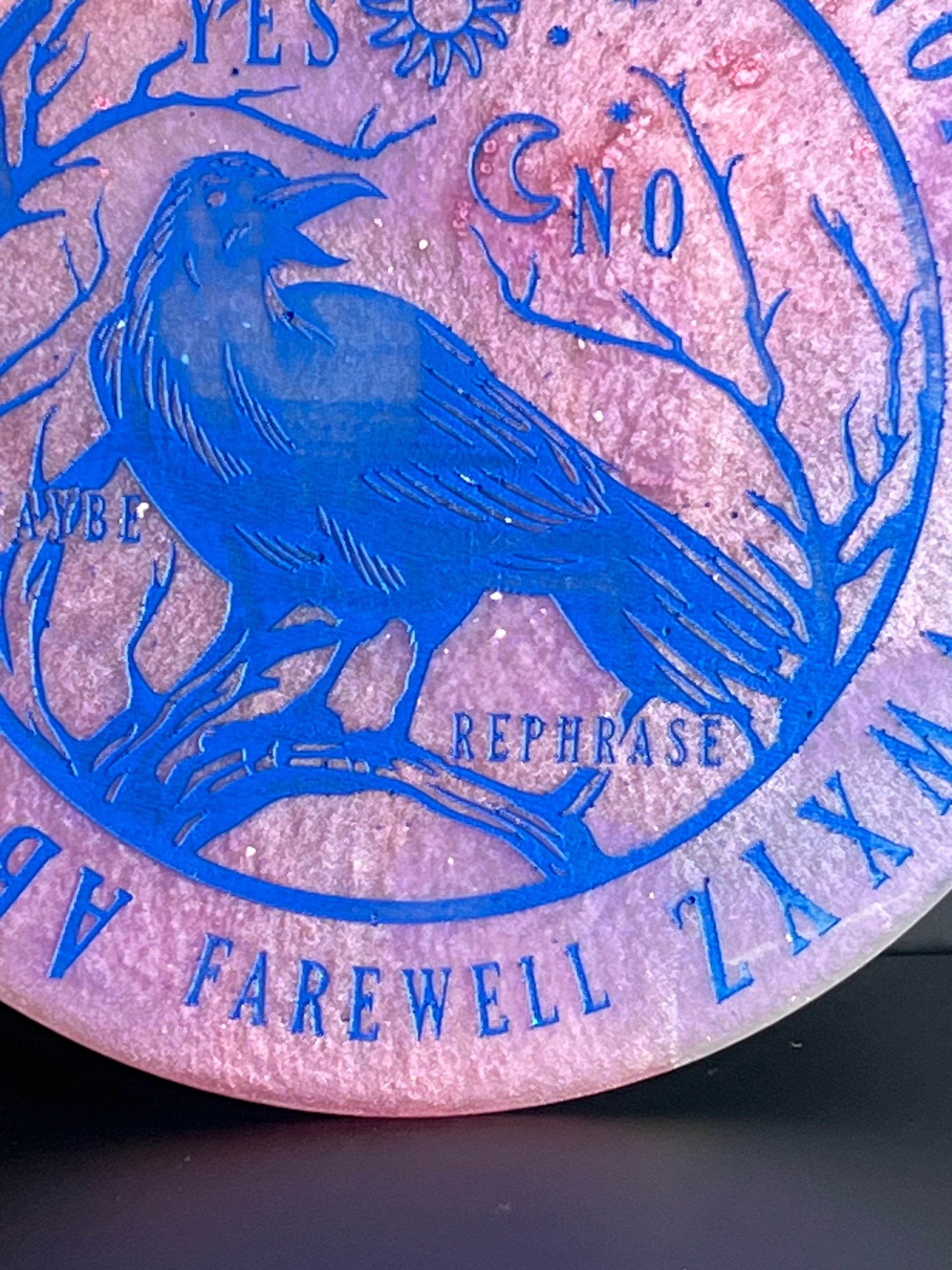 This 6-inch Raven Talking Board carries the energy of clear skies and sharpened perception — layered in soft lilac and blush tones, anchored by vivid cobalt blue detailing. It feels like insight delivered cleanly and without distortion, making it an ideal tool for questions that require clarity, discernment, and honest communication.