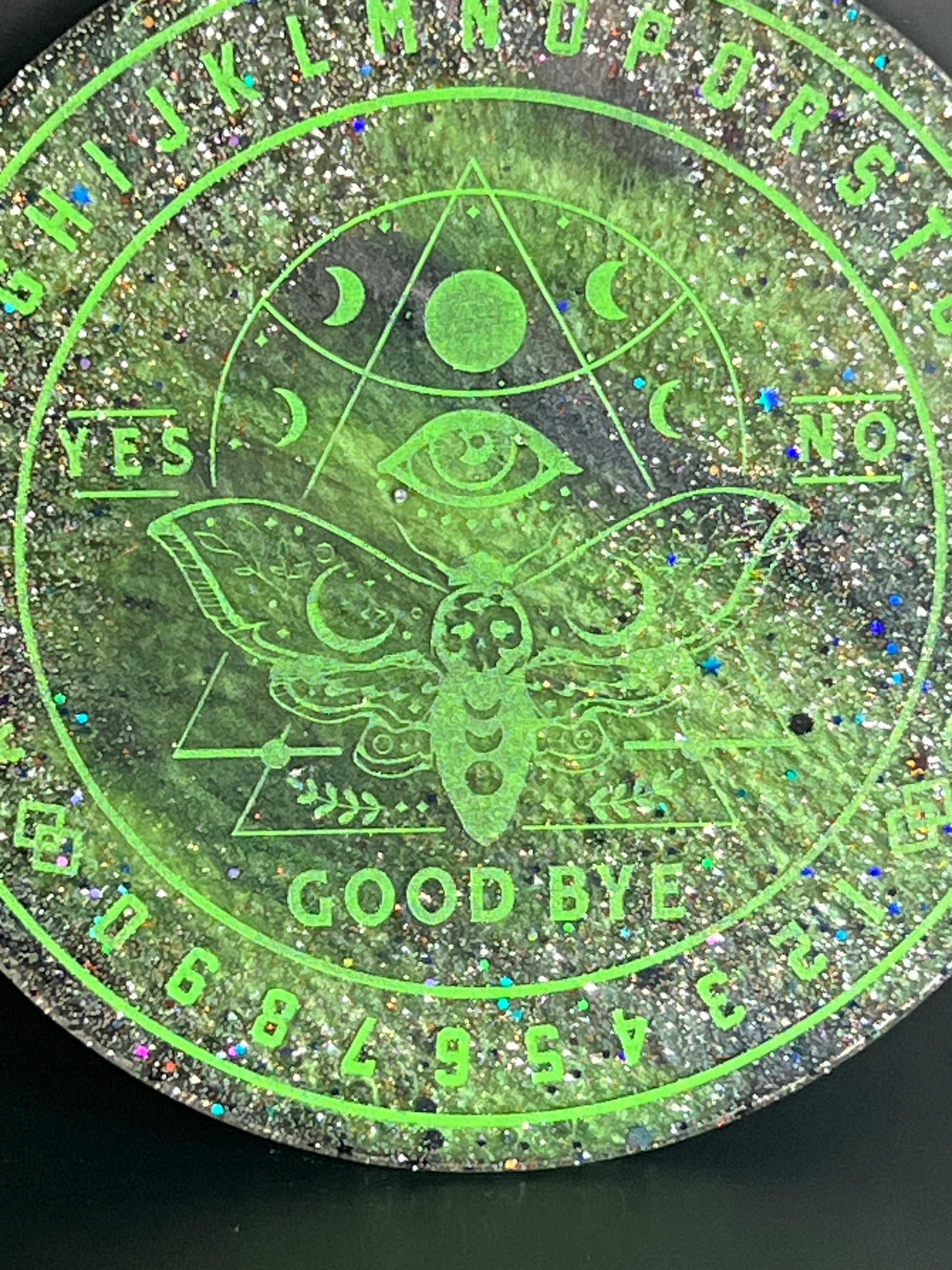 This 6-inch Moth Talking Board pulses with luminous green energy — layered in mossy depth and bright, electric highlights, scattered with star-like glitter that feels both earthy and otherworldly. Its presence is vibrant and alert, inviting insight that feels grounded, instinctual, and alive.